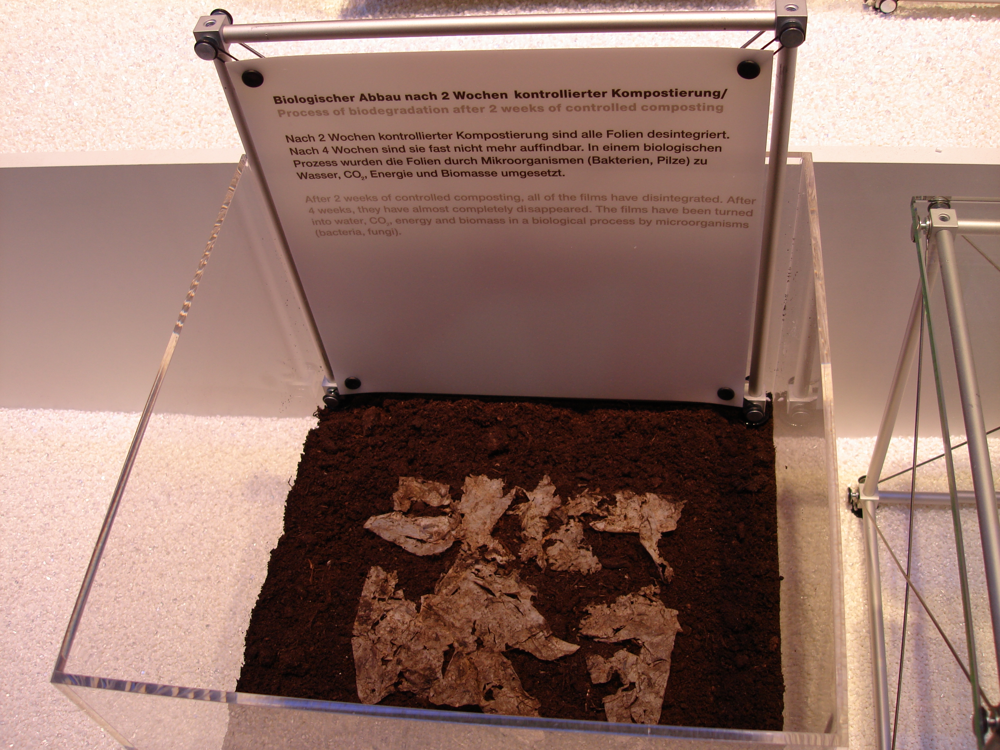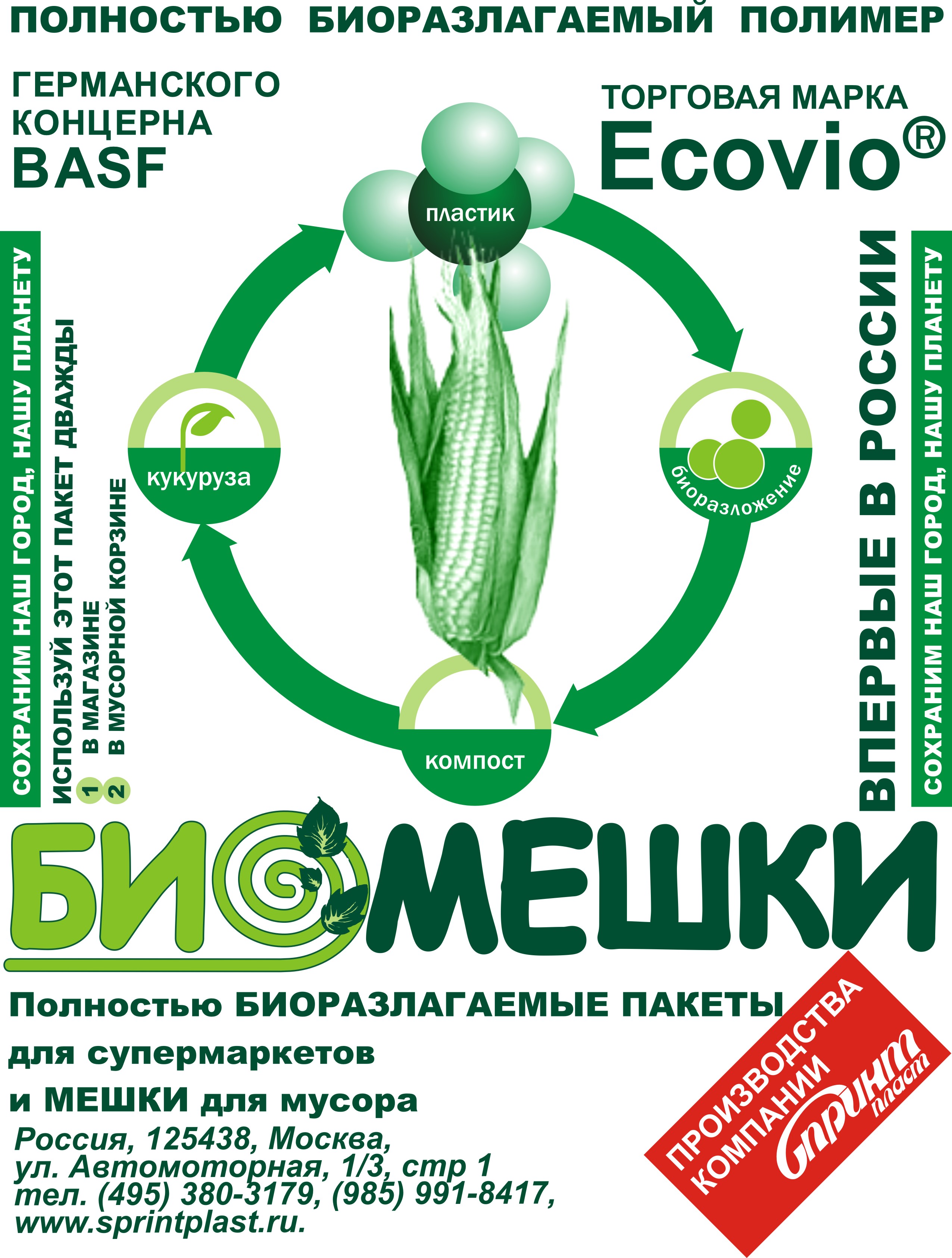 В отличие от оксоразлагаемых материалов, у которых со временем происходит лишь разрушение молекул и превращение пластика в полимерный гумус (так же засоряющий окружающую среду), материал BASF (Ecovio) является 100% биоразлагаемым, получаемый из полимолочной киcлоты (PLA), соответствущий международным требованиям по биоразлажению и полностью без всякого остатка поглощается бактериями. На стенде компании БАСФ представлена разнообразная упаковка из Эковио от пленки и бумажных стаканчиков с напылением из биоразлагаемого полимера, до вспененных биоразлагаемых подложек для продуктов питания и одноразовой посуды. Продолжая тему экологии хотел добавить следующее, что, например, в развитой Европе практически все крупные сетевые магазины перешли на биоразлагаемые пакеты и упаковку из PLA, в России пока только в Москве и Санкт-Петербурге в самых крупных магазинах редко можно увидеть упаковку с надписью «оксоразлагаемая упакова» . Надо понимать, что без поддержки государства не удастся сделать биоразлагаемую упаковку массовым продуктом, поскольку стоимость биоразлагаемого пластика дороже обычного ПЭ в несколько раз. В Москве есть компания Спринпласт, которая три года назад сделала пробный запуск биоразлагаемой упаковки, провели все нужные испытания, показали продукт на выставке Росупак и получили главный приз. Хочется побольше таких предприятий. Но думаю, нам потребуется ещё время для изменения сознания людей, и переориентации их на мысли об экологии.