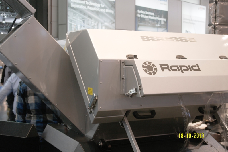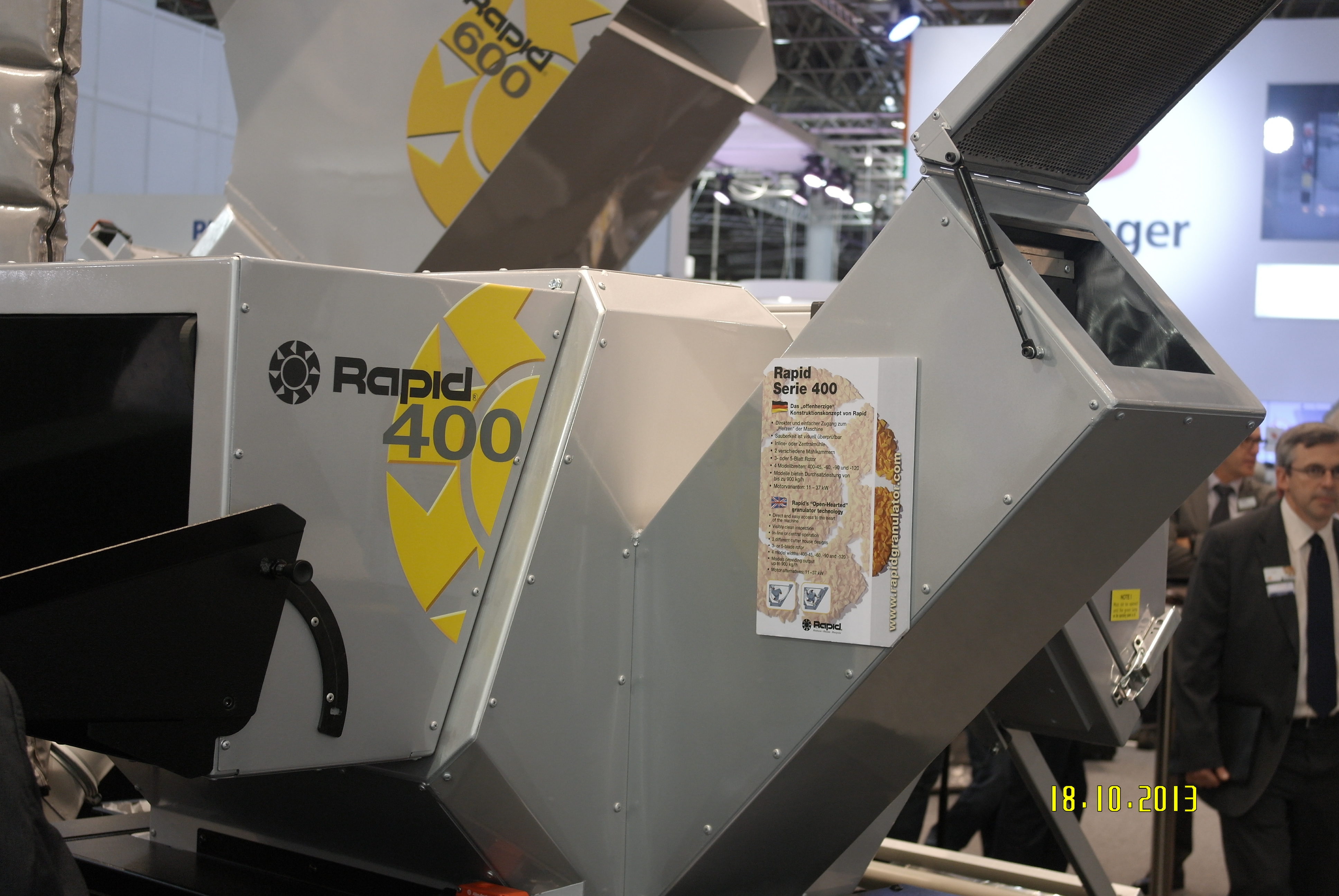Установка располагается под экструзионной линией и перерабатывает лист или пленочный скелетон онлайн. Установка известна под названием GBT (grey black thing – серо –черная штука) Низкооборотистая дробилка для жестких деталей с встроенной системой металлодетекции. Дробилка 400 серия с комбинированной тройной воронкой (для листов и пленочных скелетонов с роликовым питателем, труб или длинных профильных изделий под углом 45 , и стандартной воронкой ручной загрузки) и ситом (наполовину не дырявым) для обрубания длинных отходов.
