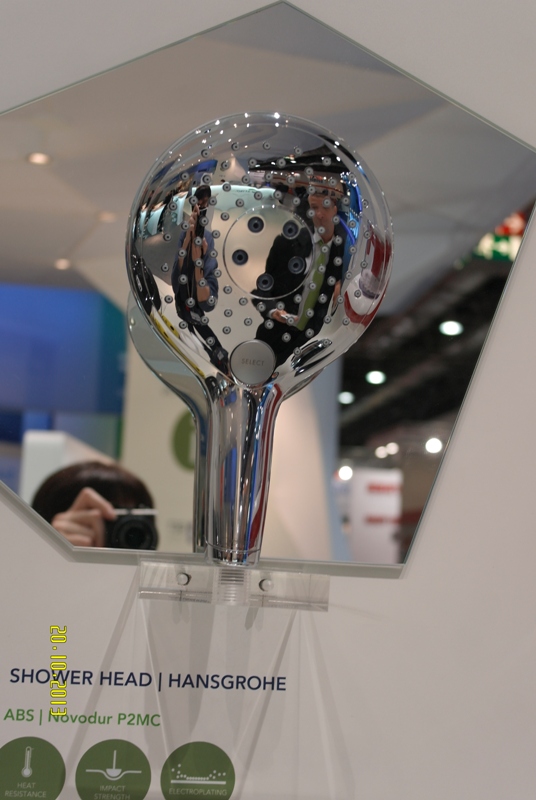 Здесь можно видеть сайдинг Альта-профиль, получен методом соэкструзии ПВХ и окрашенной ASA. Смысл в том, что ASA лучше сохраняет цвет, стойка к ультрафиолету и перепаду температур. Литье химически вспененной ASA для имитации керамики для крыш зданий, как видишь, есть возможность производить монтаж солнечных батарей. Это окно результат многолетнего проекта с компанией VEKA, вся «соль» в усиливающем профиле (голубого цвета SAN + 50% стекло). В России хорошо развивается медицинское направление, многие компании интересуются ингаляторами. На стенде представлена продукция, сделанная с применением наших материалов. Styrolution принадлежит более 60% рынка материалов для гальванопокрытия (материалов с высокой адгезией к гальванопокрытию) в Европе. 70% из которых идут в автопром.