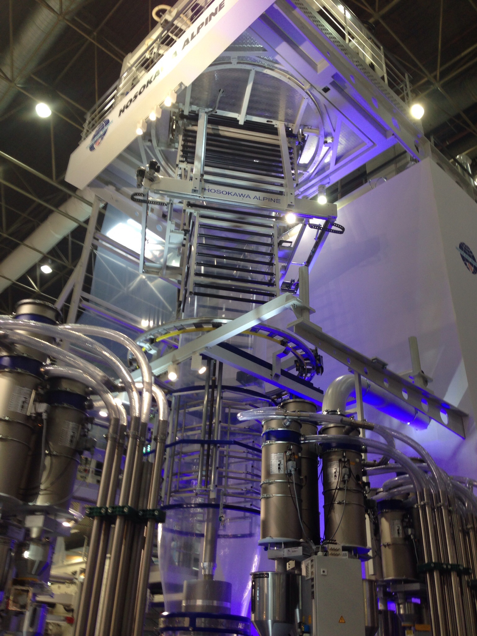 За закрытыми дверьми 5-тислойная установка, делающая термоусадочную пленку для групповой упаковки толщиной 40мкм с производительностью 1000 кг\час.