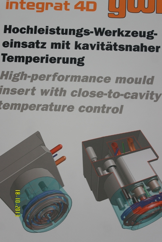 1. Технология изготовления высокопрозрачных изделий от GWK. На стенде GWK на машине ARBURG изготавливалась поликарбонатная линза, высокая степень прозрачности которой, достигалась за счет применения вариативного охлаждения, которое в свою очередь обеспечивал маленький холодильник водяного вариативного термостатирования. Вариативное термостатирование позволяет регулировать температуру по произвольно заданной кривой в течении одного цикла. Следует отметить, что для получения высокой прозрачности помимо холодильника использовали встроенную в пресс-форму систему активных вставок с интегрированными высокоэффективными нагревательными стержнями в толще формы и каналами охлаждения расположенными крайне близко к формующей поверхности (разработка GWK).