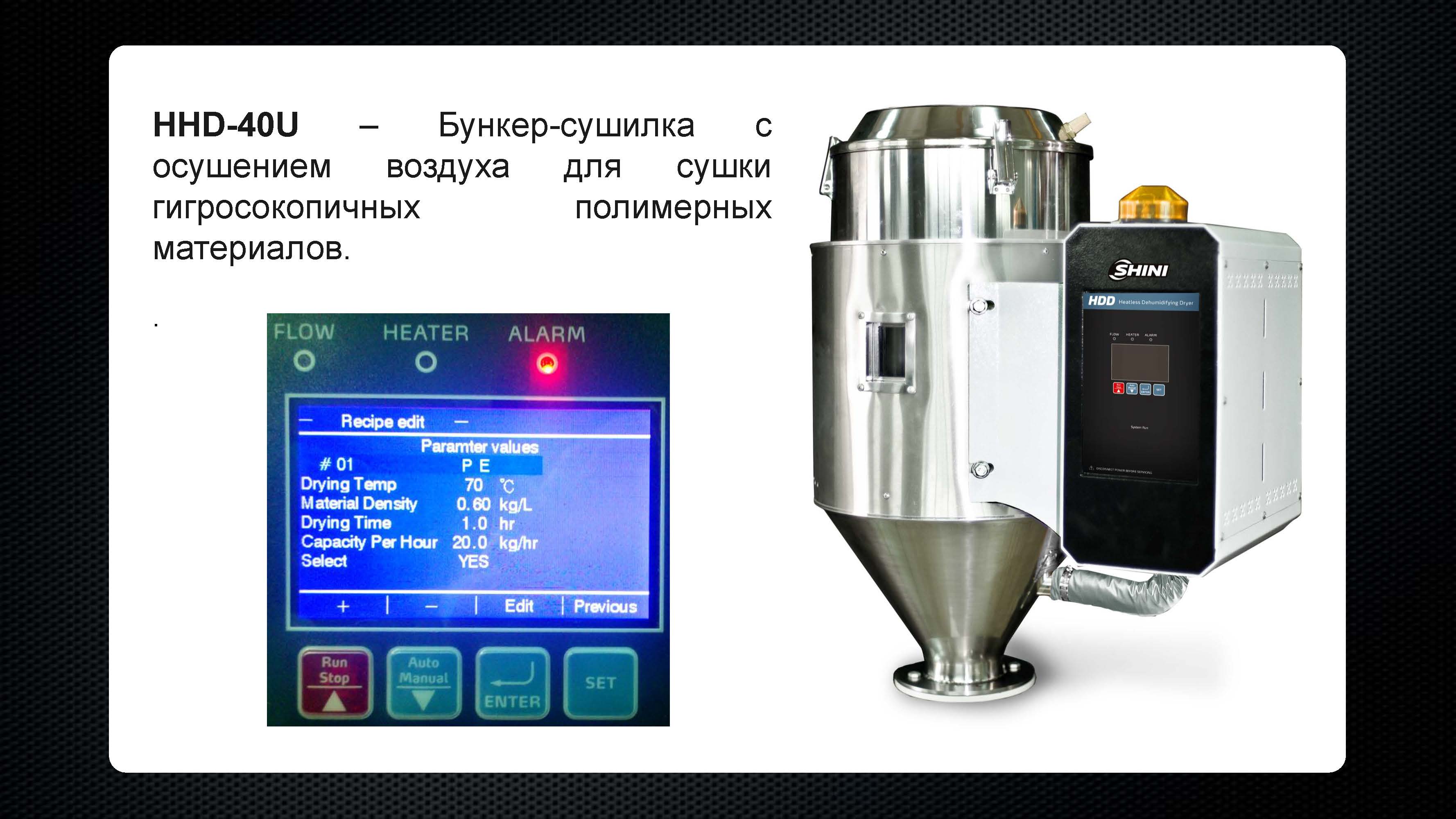 1. Бункер сушилка с осушением воздуха для сушки гигроскопичных материалов. Эта сушилка малой производительности и скромных габаритов, что позволяет установить ее на ТПА, оснащена жидкокристаллическим экраном, работает на сжатом воздухе, приятно, что модуль осушения воздуха не требует нагрева и работает в автономном режиме на микромолекулярной сетке, а, следовательно, сушилка экономит электроэнергию. Так же она подойдет для сильно гигроскопичных материалов, которые требуют досушки непосредственно перед загрузкой. 2. Загрузчик, работающий по принципу разряженного метода подачи сырья.