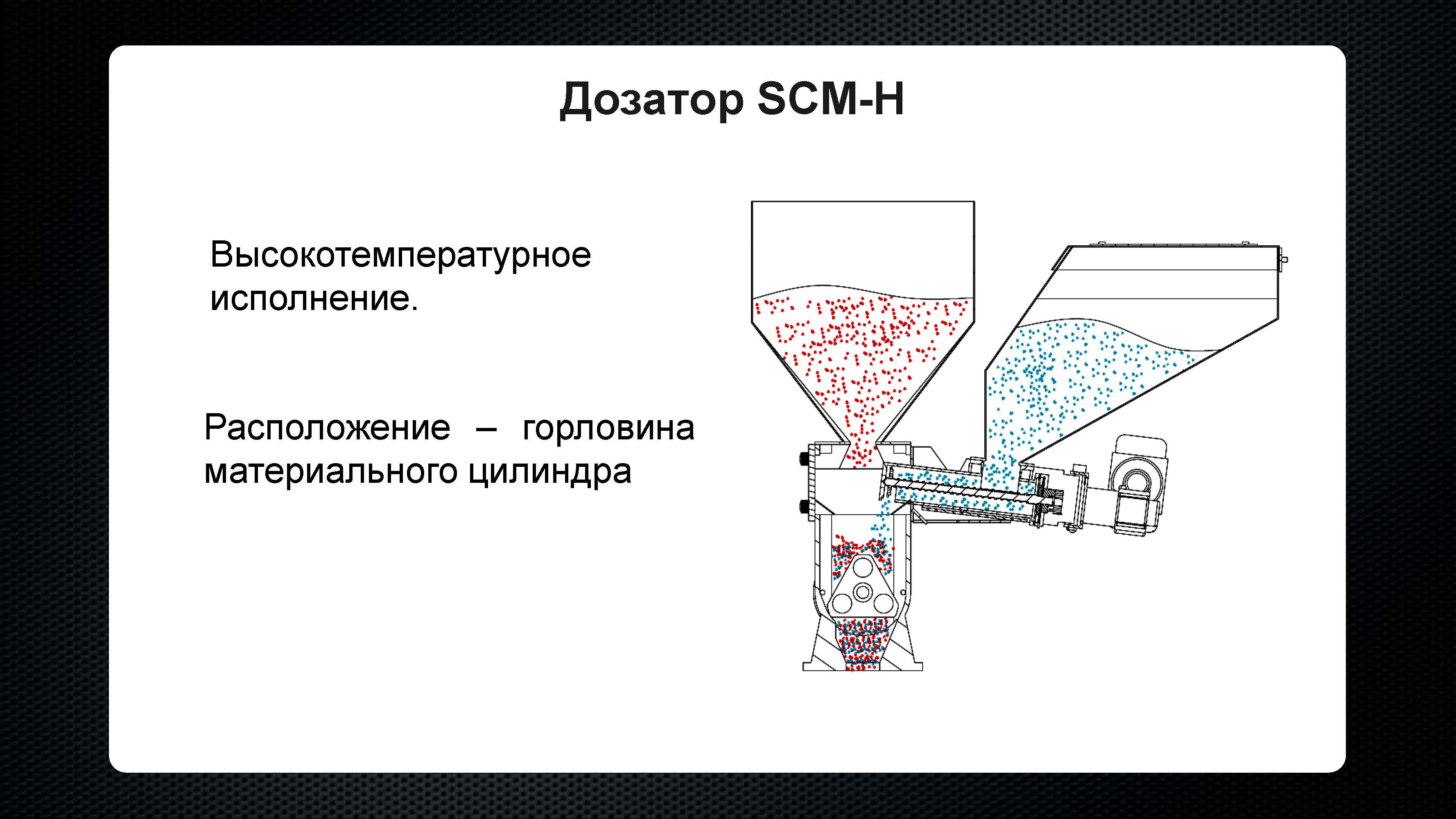 Такой способ подачи сырья позволяет избежать слипания материала и обеспечить отвод газообразной фракции в зоне загрузки. 3. Дозатор шнековый объемный с охлаждением подаваемого материала. Позволяет избежать преждевременной пластичности (слипания и налипания на цилиндр) мастербачей с низкой Т плавления в зоне загрузки шнека. 4. Объемно гравиметрический дозатор сочетающий в себе достоинства обоих видов дозаторов.