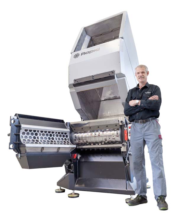 Rapid Granulator — компания, специализирующаяся на разработке оборудования для измельчения пластиков, представляет на К-2016 новое поколение своих шредеров, серию Raptor. Это первые в мире шредеры с технологией открытого доступа. Фронтальная дверь с боковыми петлями открывает неограниченный доступ к ротору и ситу, которое смонтировано в двери. После открытия двери можно откинуть воронку шредера назад, тогда все крепежные соединения доступны снаружи для работы с пневматическим инструментом.