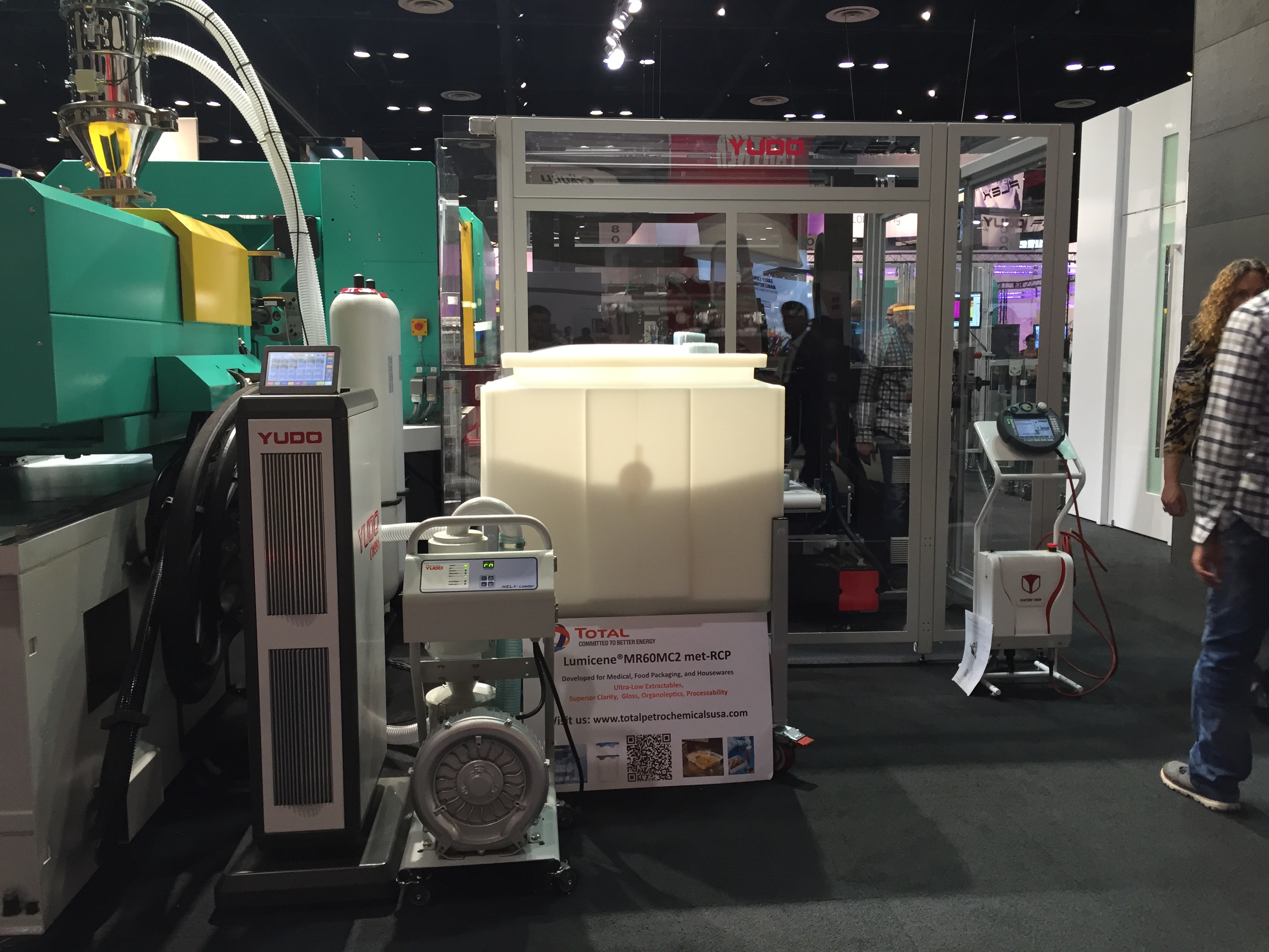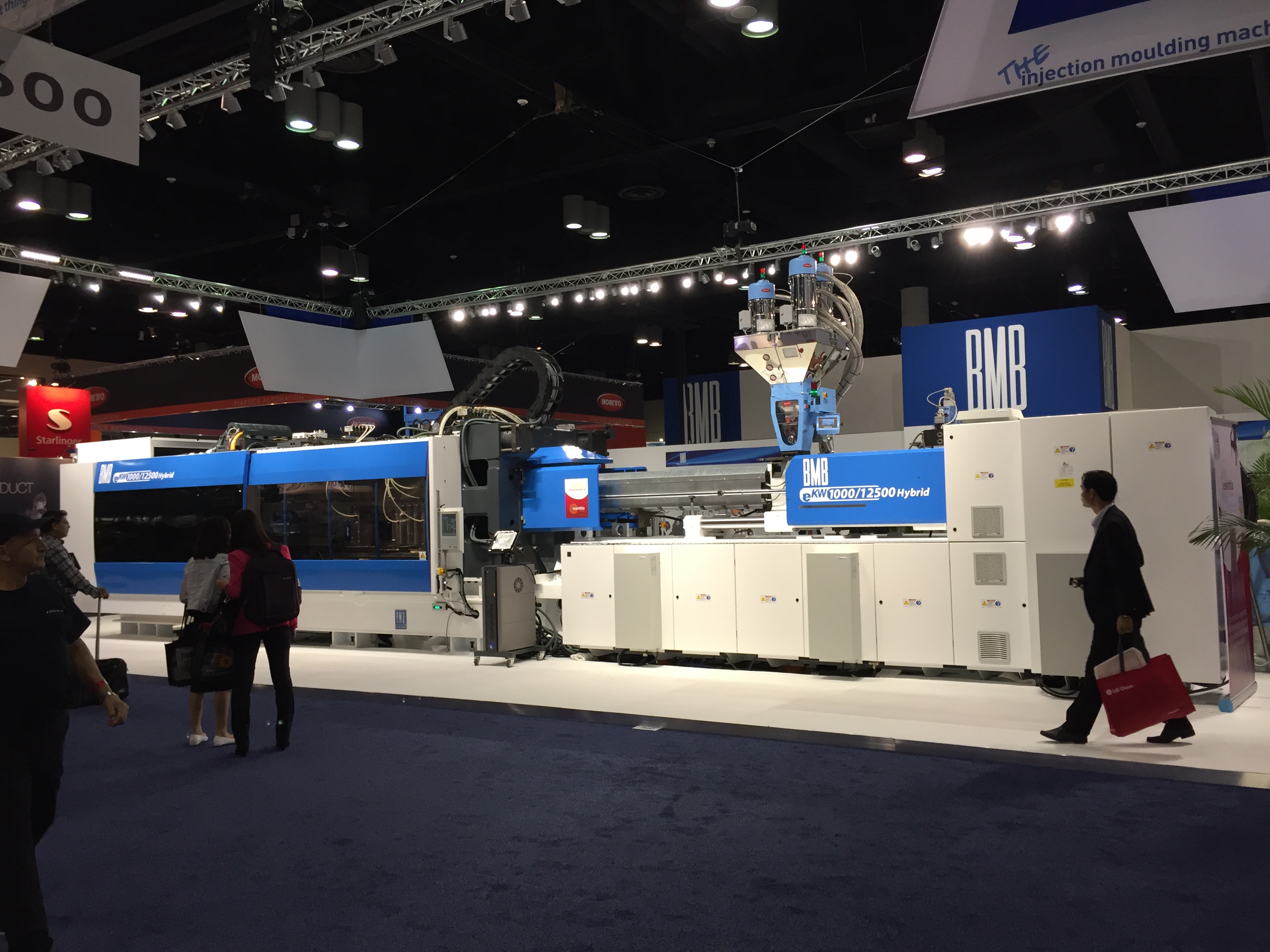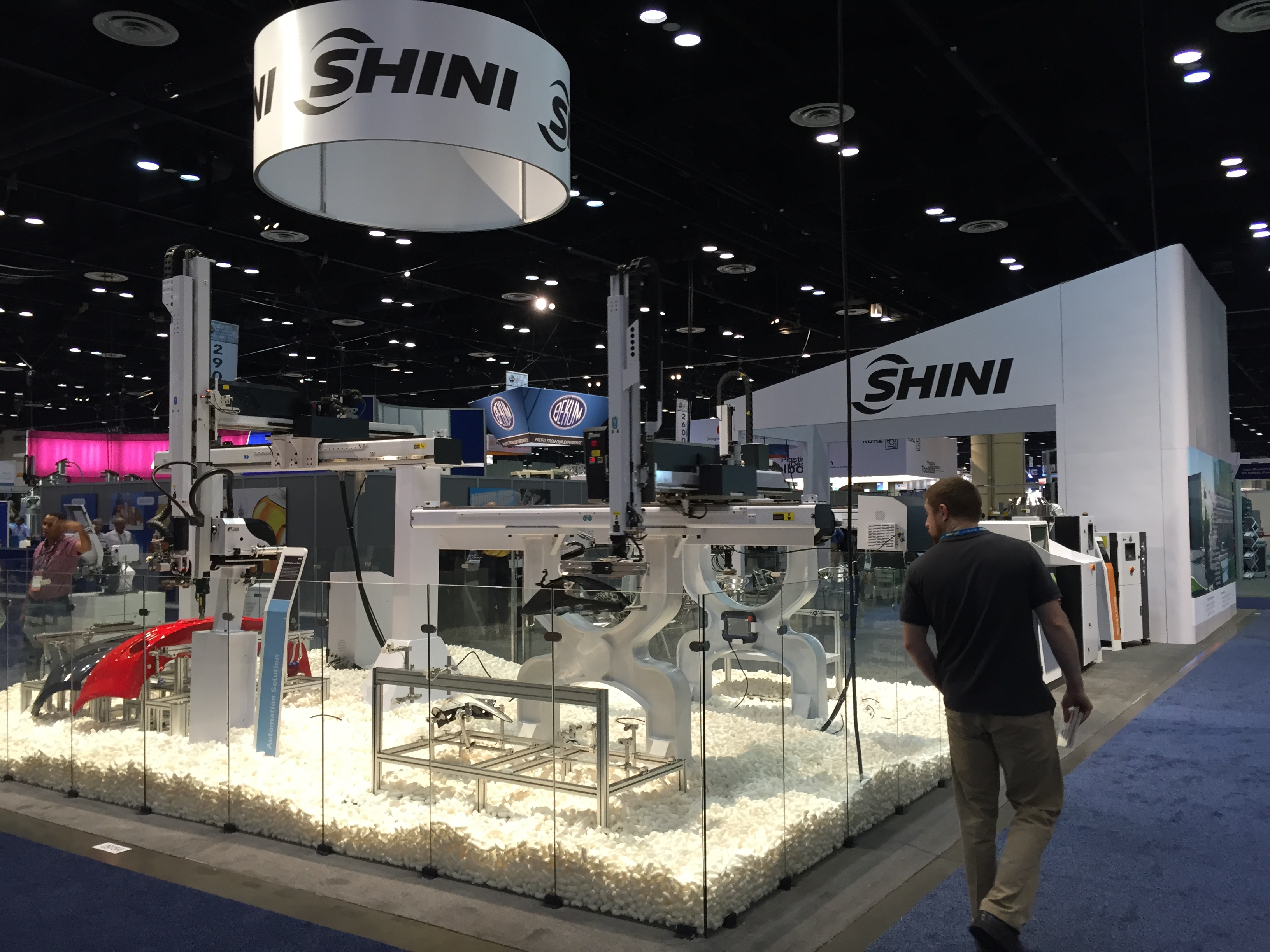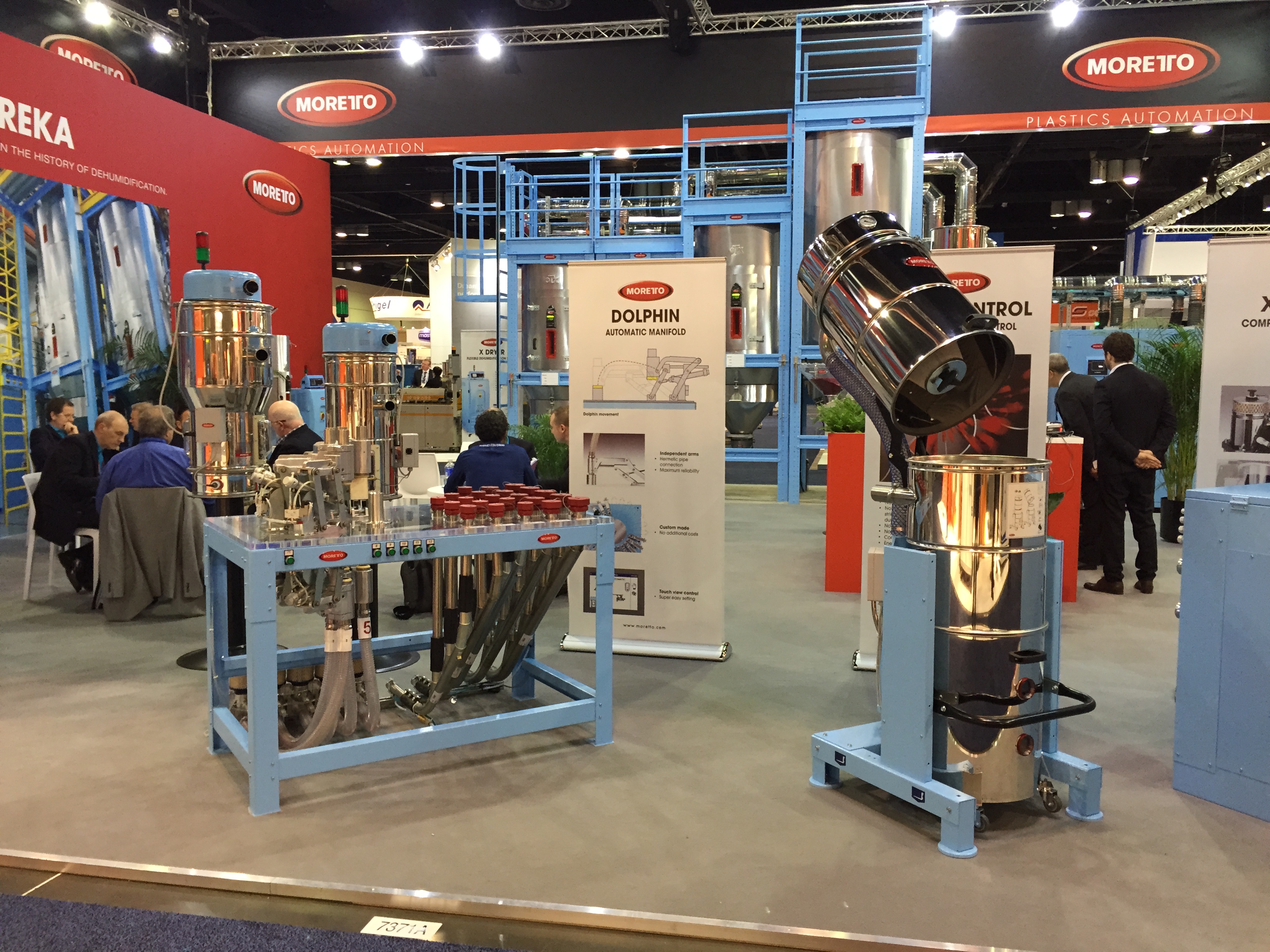 Много высокотехнологичного вспомогательного оборудования ожидаемо показал американский лидер Maguire, который предлагал 5 лет гарантии на всё оборудование. Их американский же конкурент AEC, работающий в нише low-cost тоже не подкачал, а вот европейские лидеры как-то потерялись. Слабо выступил Piovan, Motan, не видно было компании Koch. Единственное исключение – как всегда огромный стенд, полный всевозможного оборудования от Moretto. Сам основатель компании сеньор Ренато присутствовал на стенде и активно рассказывал о своих системах сушки Eureka, совершивших революцию в этом важном процессе. Китайских производителей периферии, похоже в Америке не воспринимают всерьез. Дошло до того, что славная компания Shini выступила на NPE в непривычной роли изготовителя… роботов. Да.