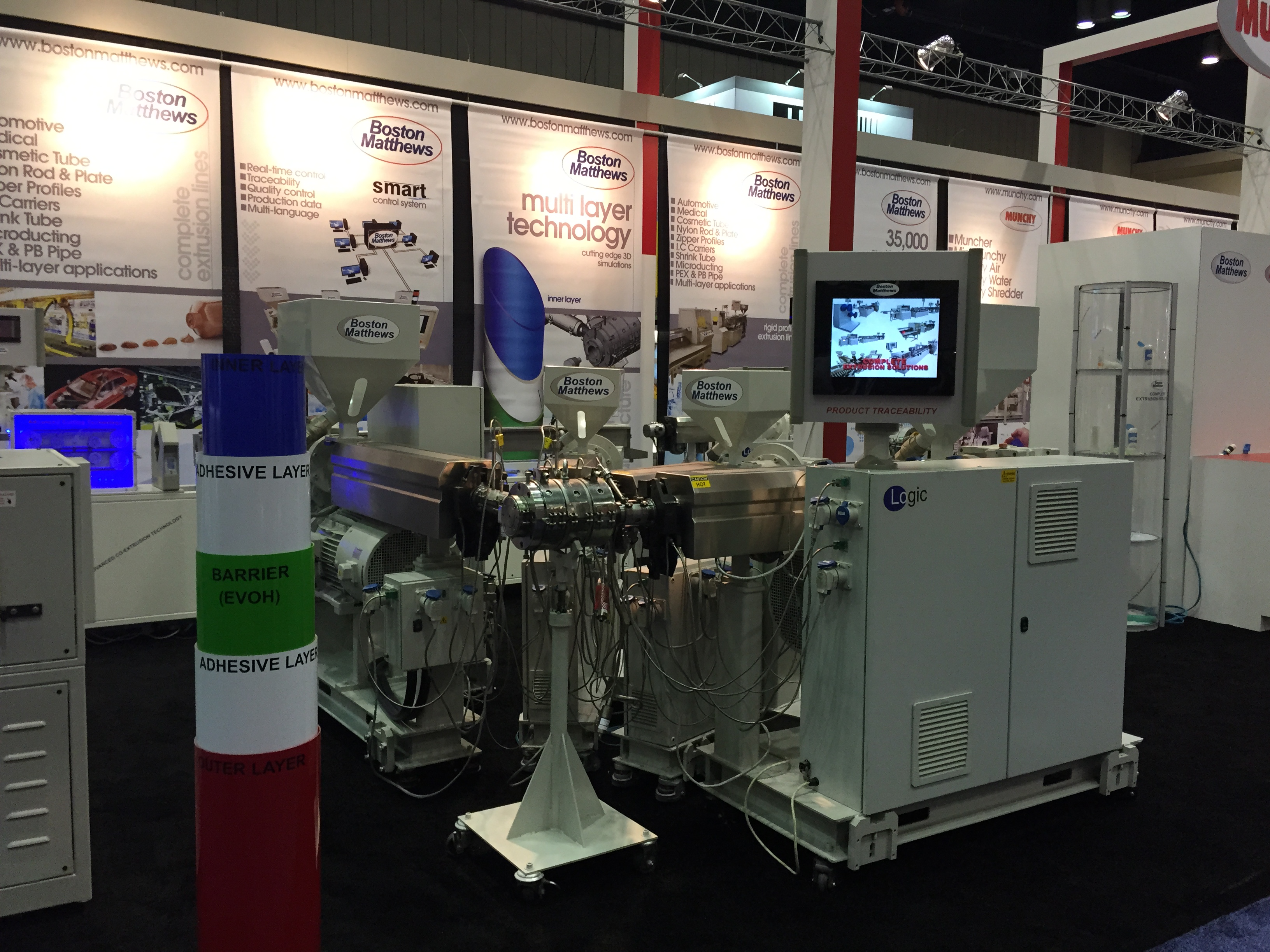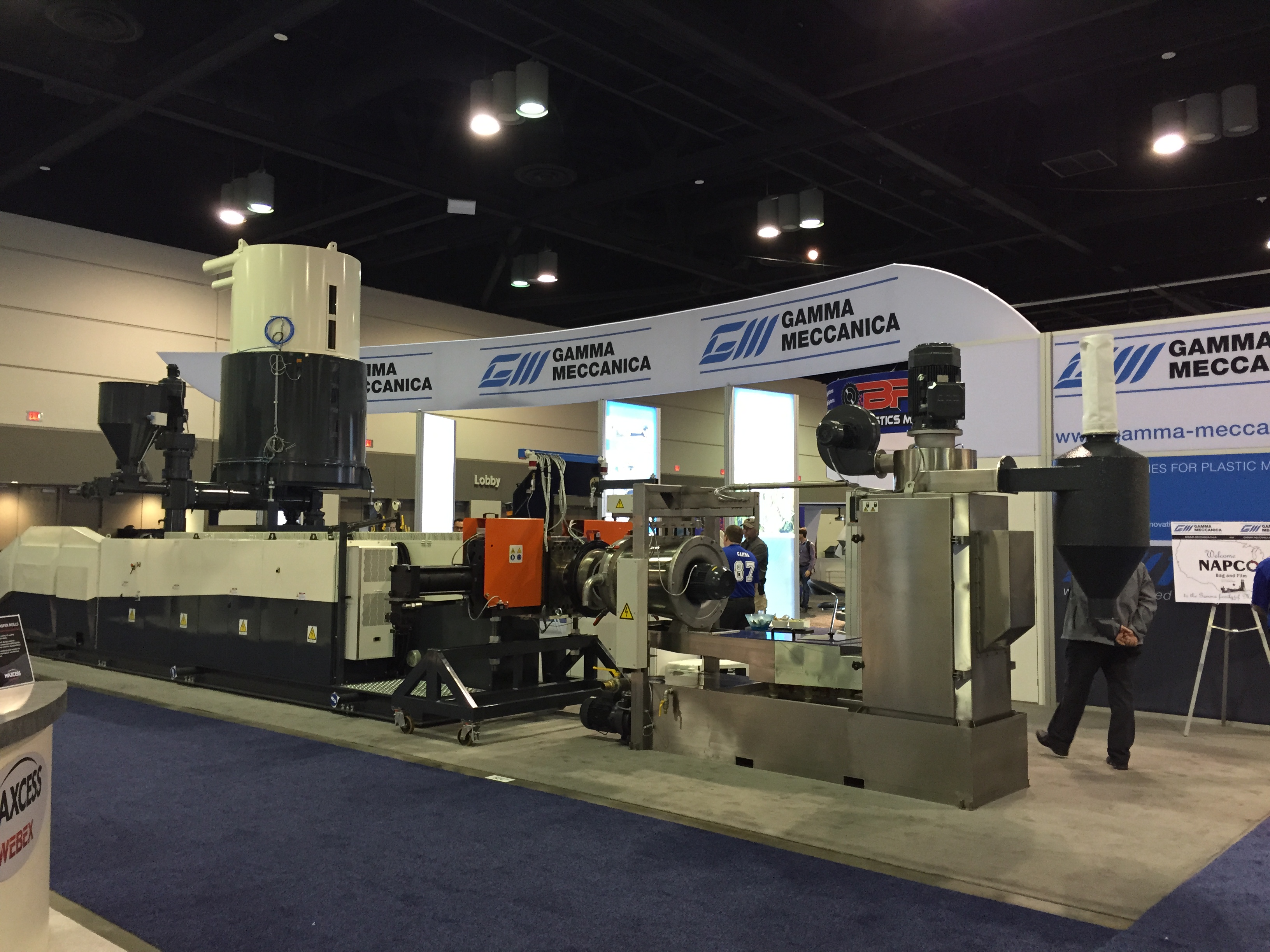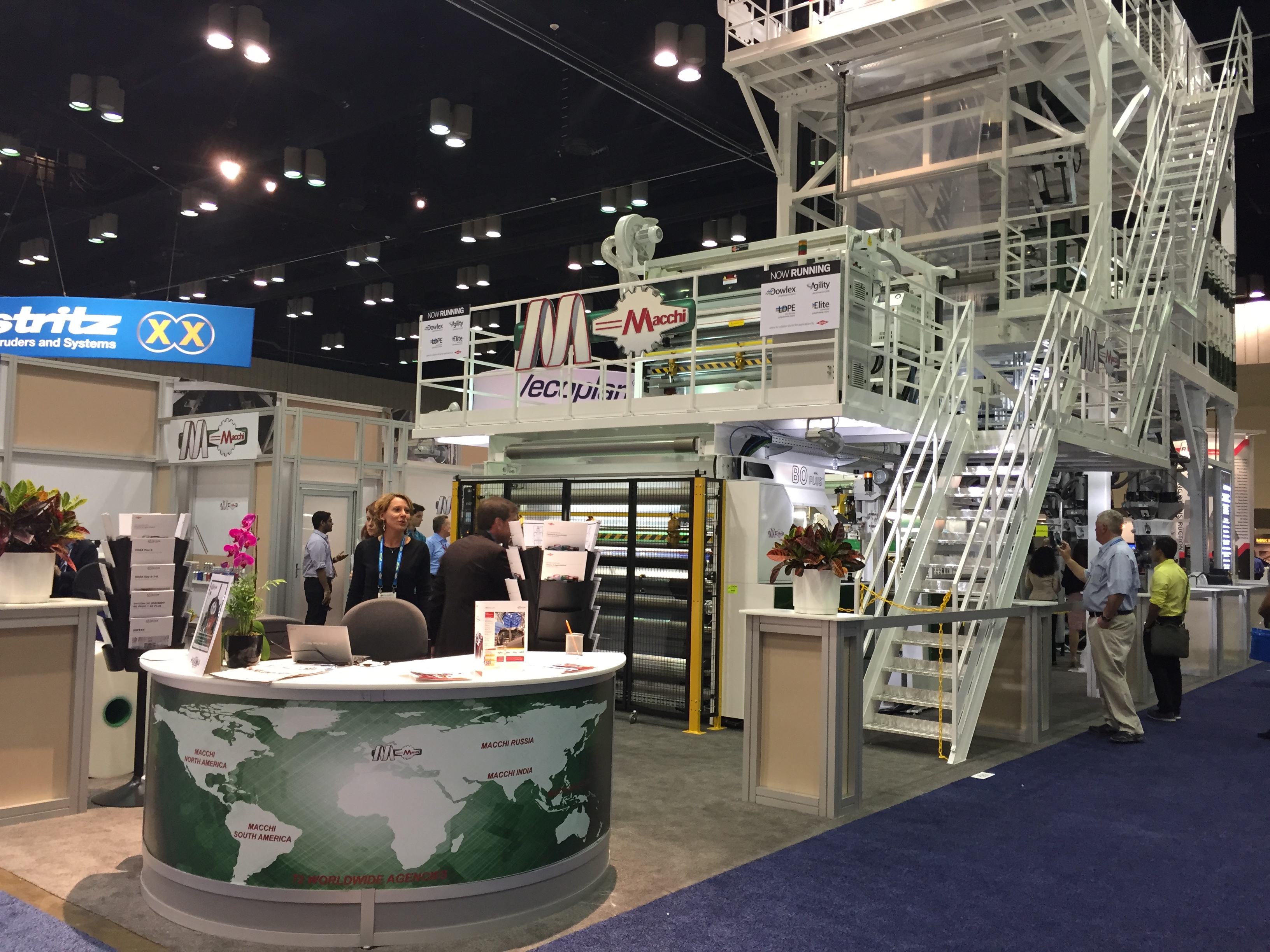 Из экструзионного оборудования довольно скромно показали себя турецкие компании. Так же затерялась тема экструзии ПВХ профилей, которая часто правит бал на выставках. Видимо, не любят американцы строить и отделывать жилища и прочие здания этим экологичным материалом. На передний план вышла экструзия пленок, «пакетки» и тому подобное. Мощный стенд организовала группа Bruekner-Kiefel, а итальянская Macchi установила самую большую по нашей оценке производственную линию выставки NPE – пятислойную пленочную. Подобные линии, но поменьше привезли и китайцы, например LungMeng. Естественно, не могли ударить в грязь лицом американские изготовители экструзионной техники, малоизвестные у нас. Так, для выставки громадную линию по компаундированию привезла компания Steer, а BostonMatthews, наоборот, показала линию маленькую, зато мульти-соэкструзионную. Устроили мощную экспозицию у себя дома экструзионщики из Davis-Standard, которые обычно сильны и на европейских мероприятиях. Компания Nordson организовала огромный стенд с
