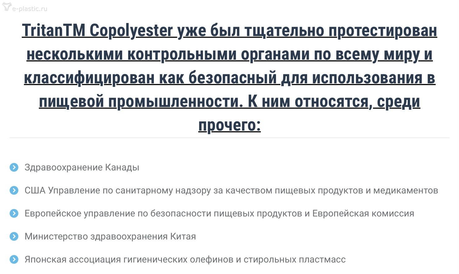 Речь в материале идет о Тритане - сополимере компании Eastman, который уже несколько лет используют практически все ведущие изготовителе товаров для дома в Европе и Америке. До России новомодный и довольно дорогой полимер всерьез так и не добрался. Единственным относительно крупным производителем посуды (а вовсе не бутылок) из Тритана является подмосковная компания "Бытпласт". Да и она значительную часть продукции отправляет на экспорт, в ту же Европу.