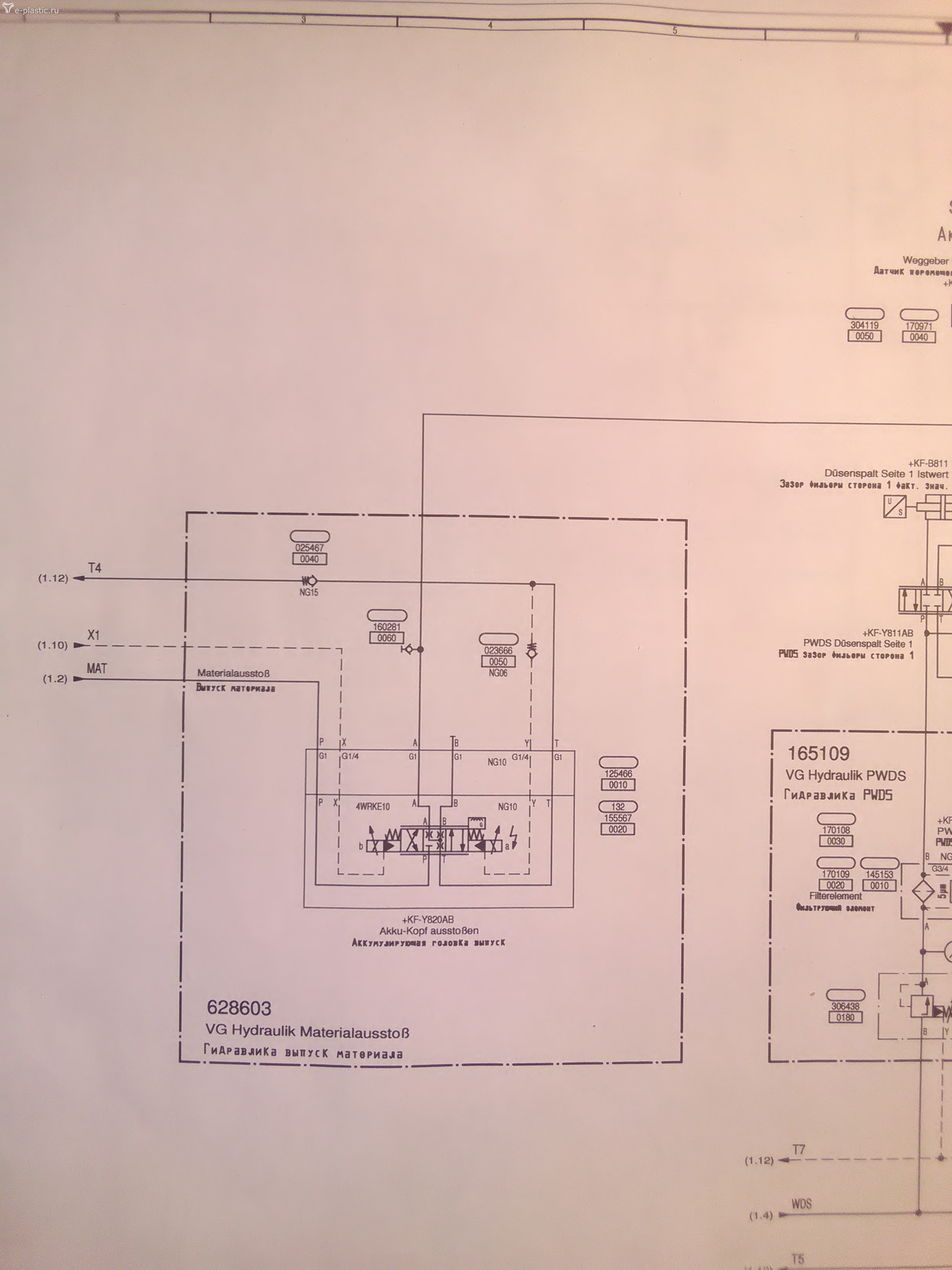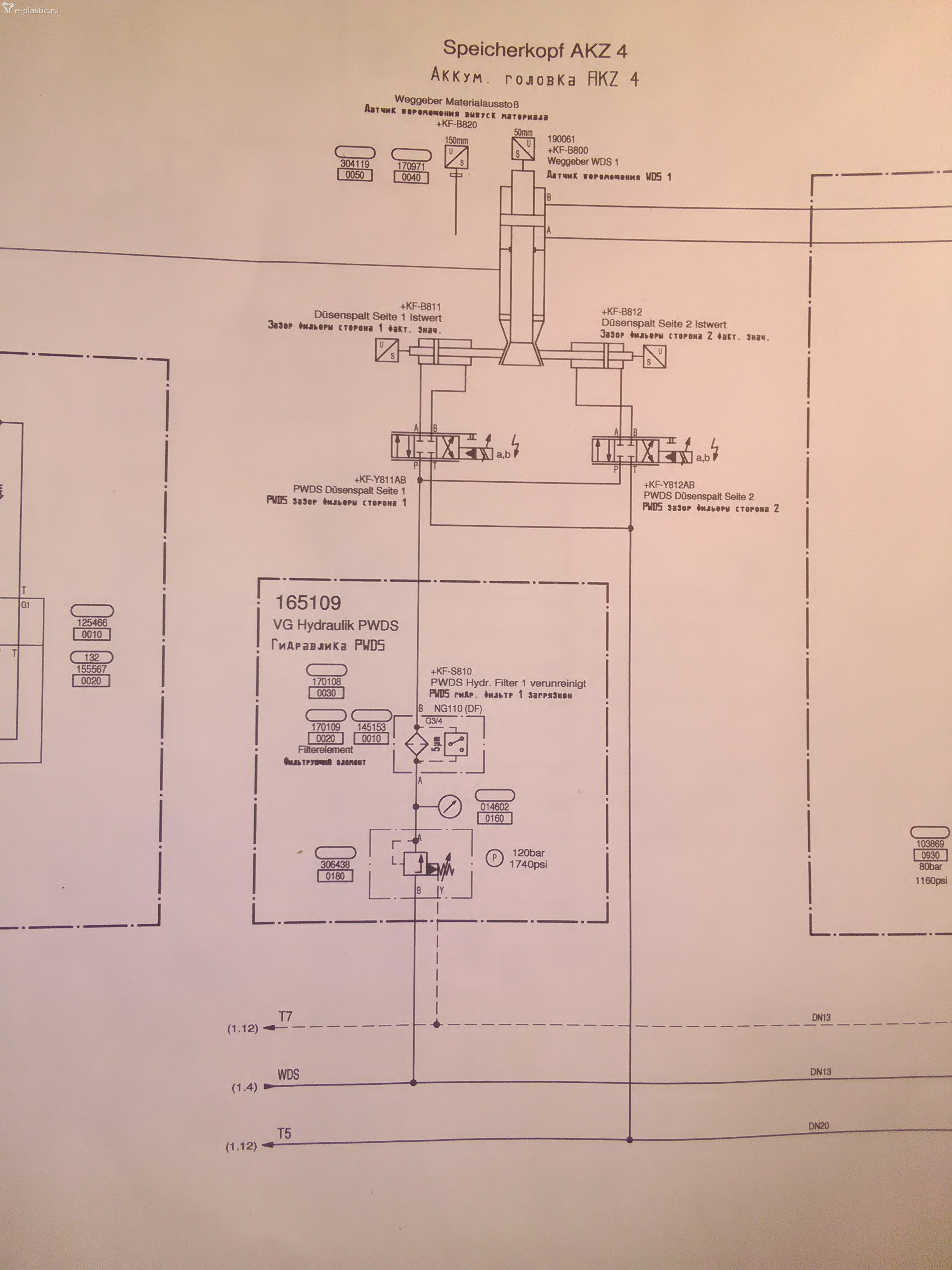 Поток на лево к выходу МАТ идёт от насоса Р1 низ. Давл. В направлении одного из блоков экстузионной системы материального цилиндра, его задача выпуск материала. Блоков там три, лист сх √5. К остальным Двум блокам идёт поток насоса высокого давления Р3. Через выход WDS/PWDS. Средний блок управляет фильерой. Правый блок отвечает за WDS/PWDS.