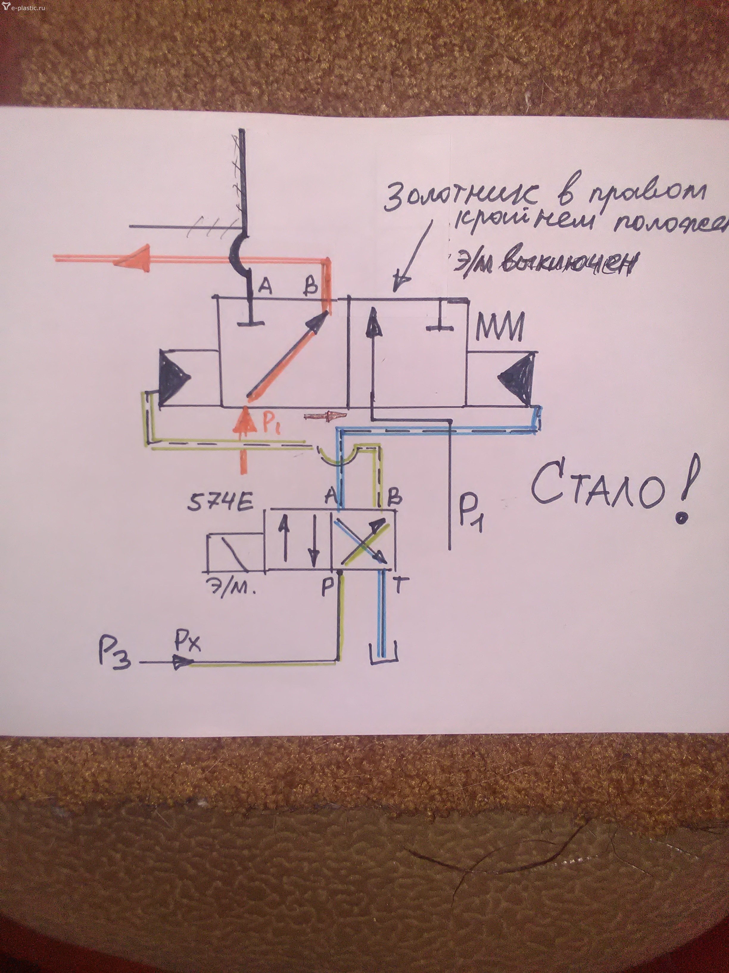 Мысли в виду новых обстоятельств: 1)Старый распред , 574сх. При выключеном э/м в нейтрали поток насоса Р1 идёт прямо. При включенном э/м поток идёт на лево к выходу МАТ к материальному цилиндру. 2) Новый распред , 574Е . При выключенном э/м нижний распред сразу перекинет направление потока на лево в направлении к мат. Цилиндру. При включенном э/м поток пойдёт прямо. То есть нижний основной золотник теперь работает наоборот. Думаем как это повлияло на систему? Без циклограммы неудобно. (У этого реверса видим управление Х внешнее, заведено от насоса Р3. СливY в основной слив. Если продаёт давление На насосе Р3 то исчезнет управление Х с левой стороны и пружина нижнего золотника поставит его в нейтраль. ) это так для инфы. Ачто даёт нам изменение схемы распределения потока насоса Р1 пока не соображу.