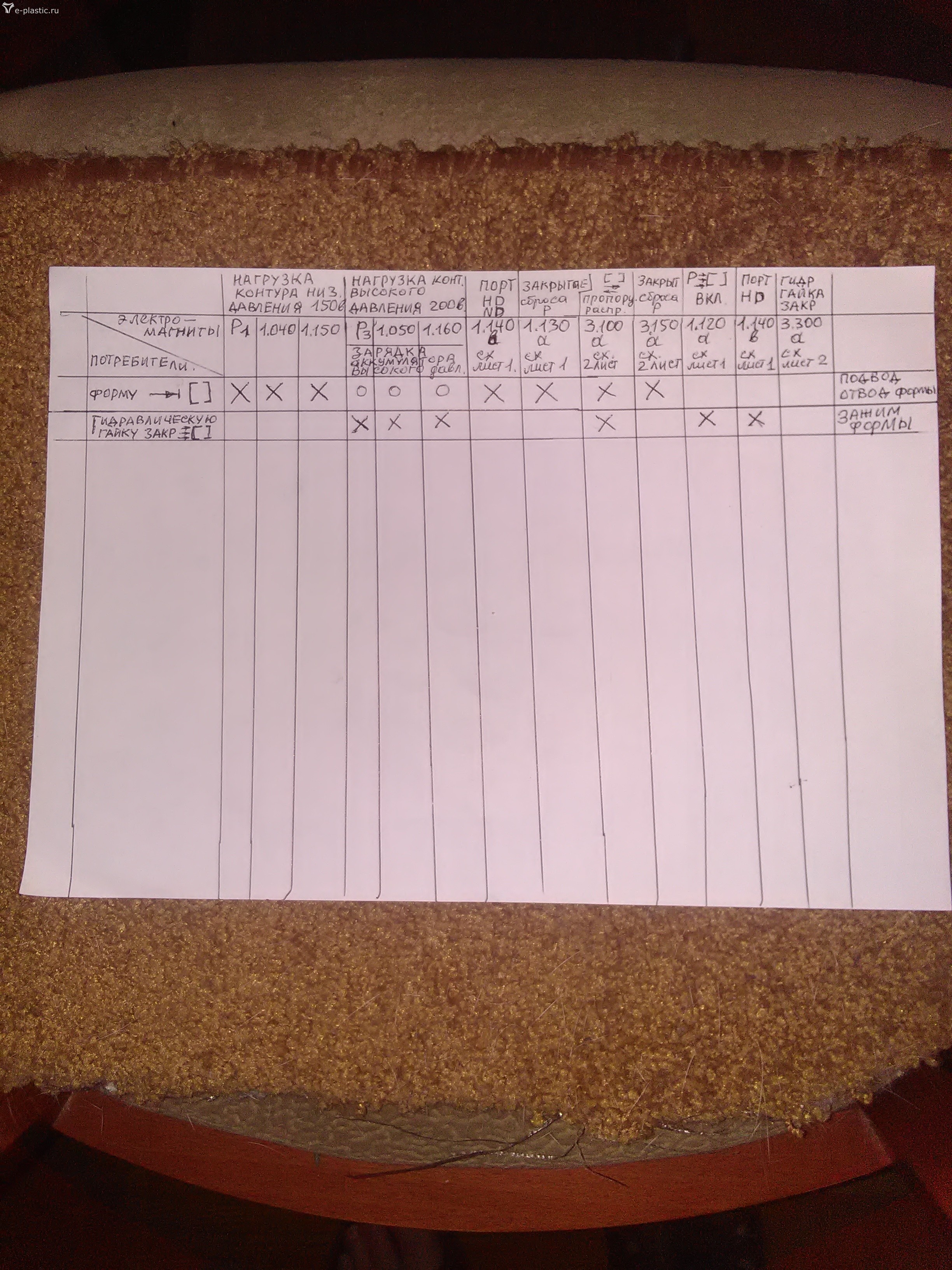 Колхозная Циклограмма. На будущее переименовать этот гимор, наклеить подписать фишки и упорядочить последовательность включений. Прописать красивую таблицу хотя бы примерно так. Всегда так делали. Оч оперативно помогает. На фото. Зажим гидравлической гайки - зажим формы. Вот тут и падает давление. Если нагрузка насоса Р3 есть то ясно что давление исчезает при включении или 1.120 или 1.140 забыл крестик поставить на 3.300 Крест- включено. О - выключено. Эту линию Насоса Р3 можно с помощниками и в ручную проверить