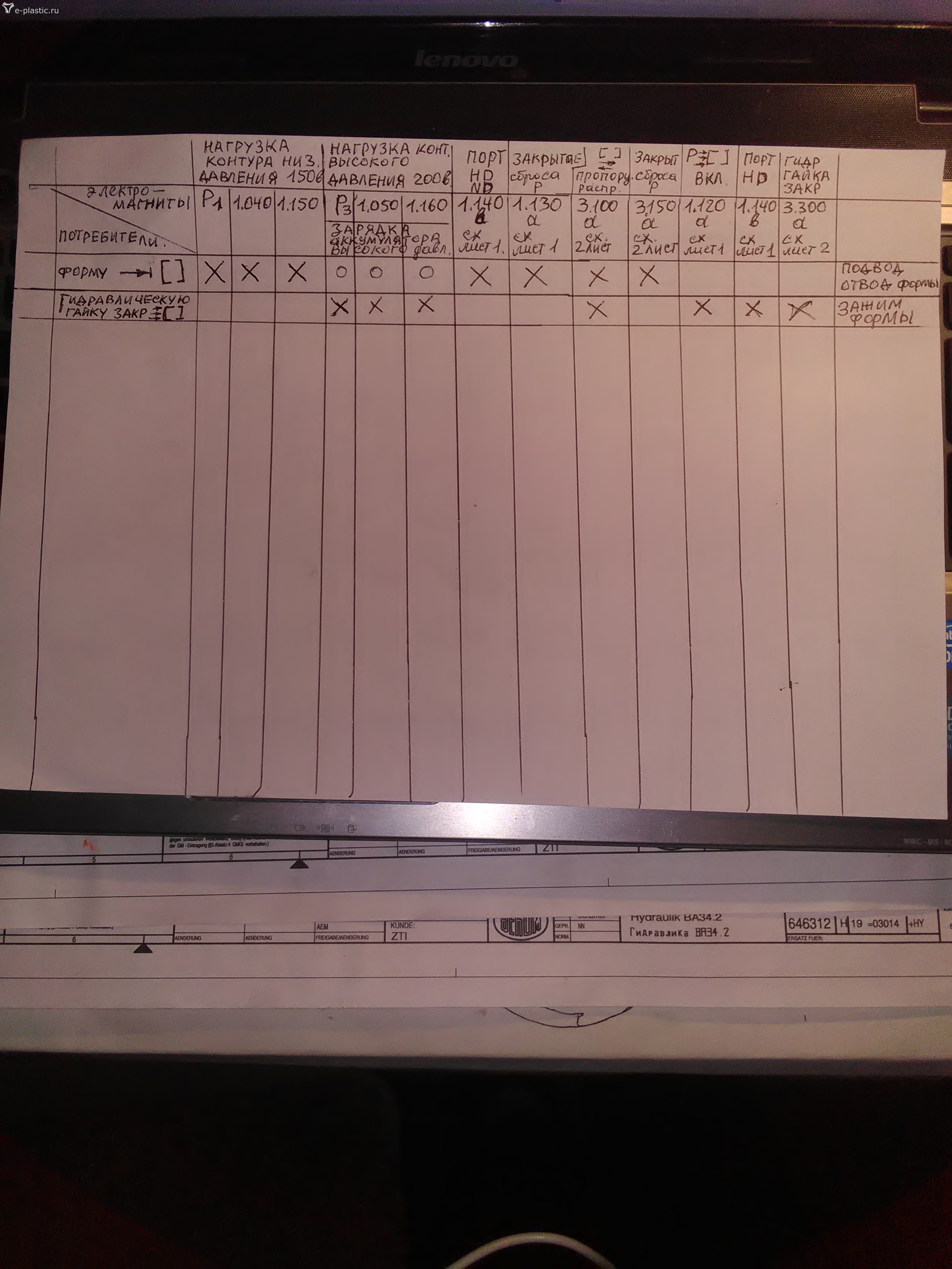 Колхозная Циклограмма. На будущее переименовать этот гимор, наклеить подписать фишки и упорядочить последовательность включений. Прописать красивую таблицу хотя бы примерно так. Всегда так делали. Оч оперативно помогает. На фото. Зажим гидравлической гайки - зажим формы. Вот тут и падает давление. Если нагрузка насоса Р3 есть то ясно что давление исчезает при включении или 1.120 или 1.140 забыл крестик поставить на 3.300