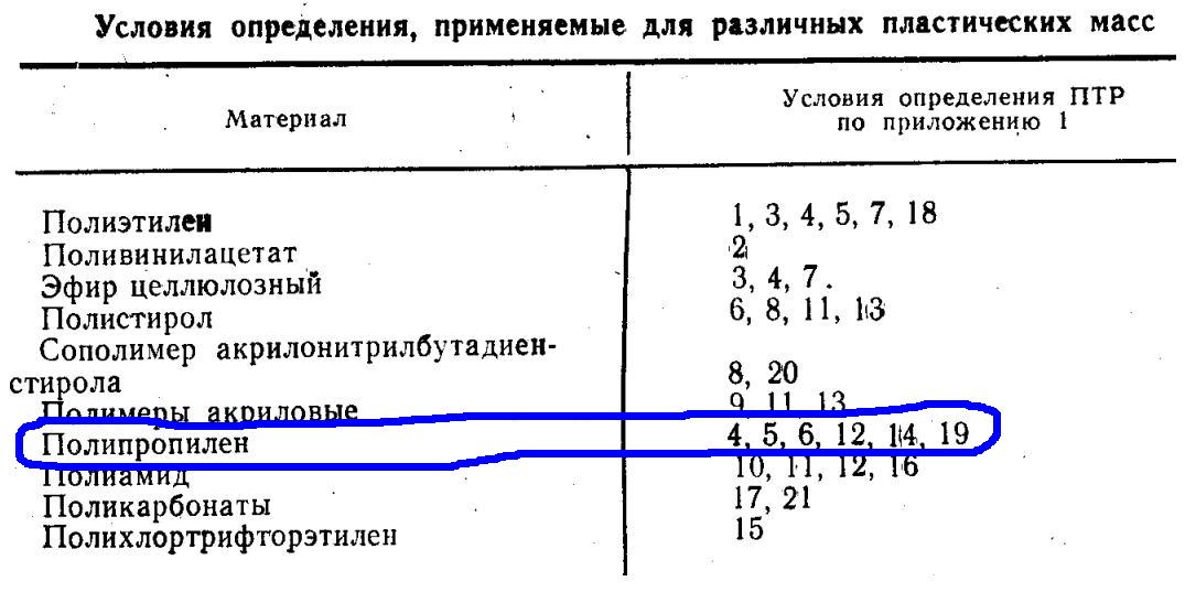 Добрый день! На производстве занимаемся переработкой ПП, недавно приобрели испытательное оборудование ИИРТ, чтобы мерить ПТР. Изучил ГОСТ 11645, а в конце таблица - с температурами и грузами, при которых нужно проводить испытания для тех или иных пластиков. Возник вопрос!!!!