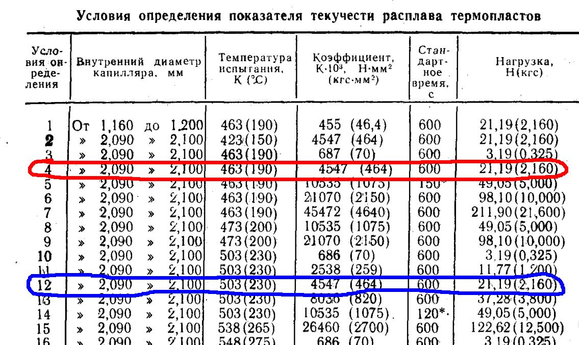 Для полипропилена можно делать при 190 или 230 с весом 2,16 кг. Коэффициент там одинаковый и время тоже! так вот и загвоздка.