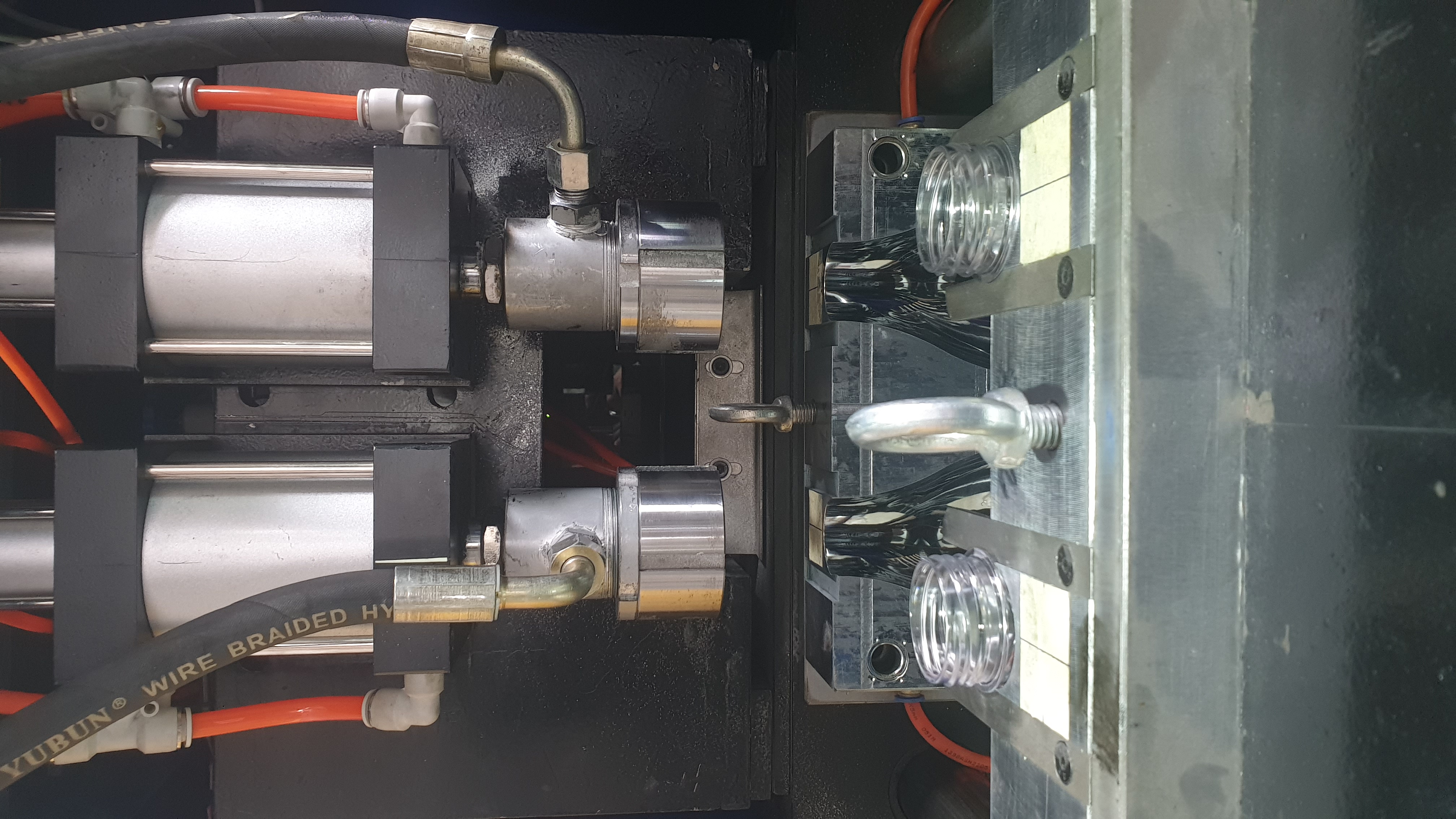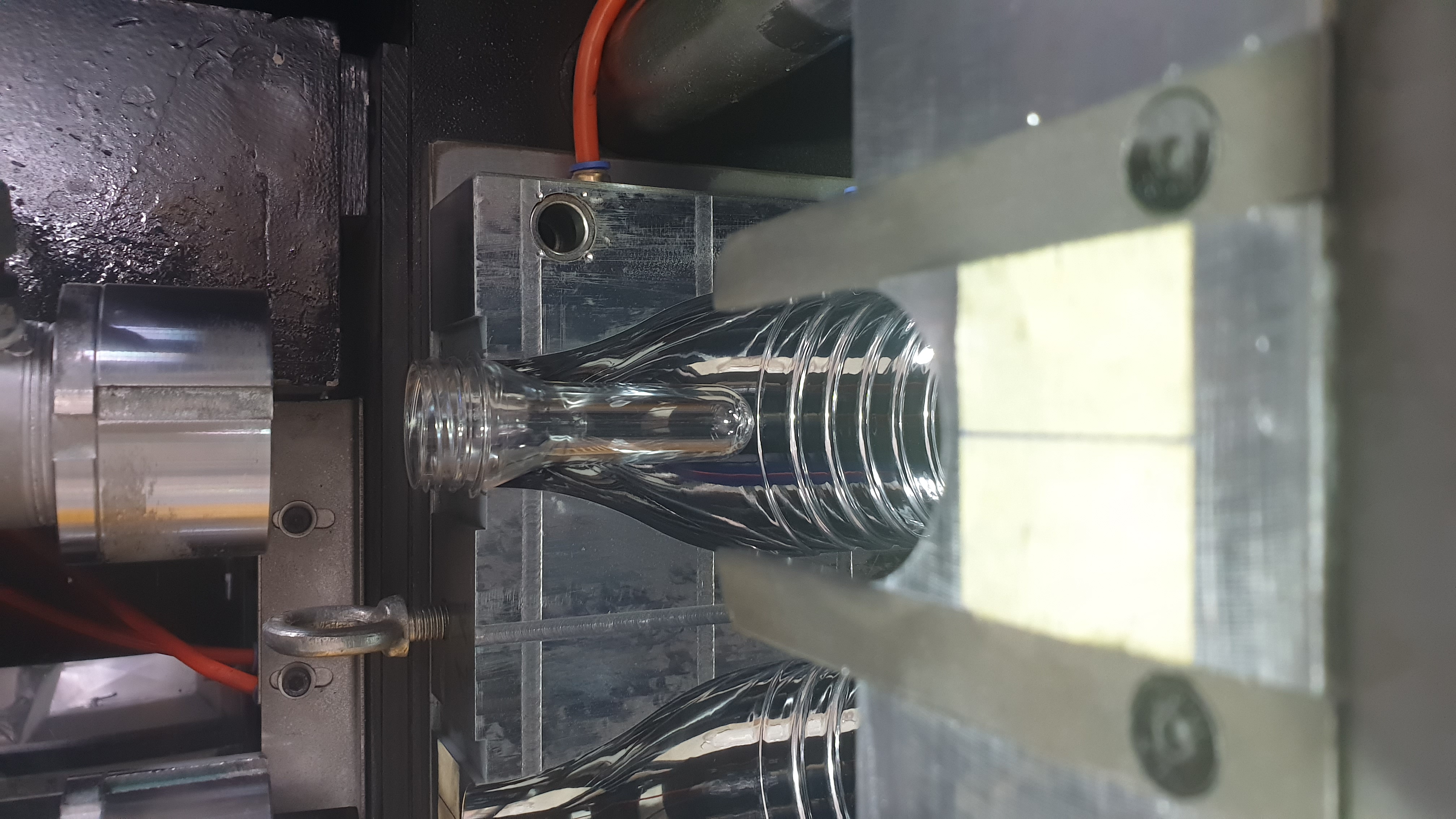 предположительно бобышки и резьбовая часть преформ охлаждаются обдувом? Или все таки вода подается? Если обдув - желательно перейти на водяное охлаждение, если охлаждается водой - отрегулировать трубы и установить щитки.