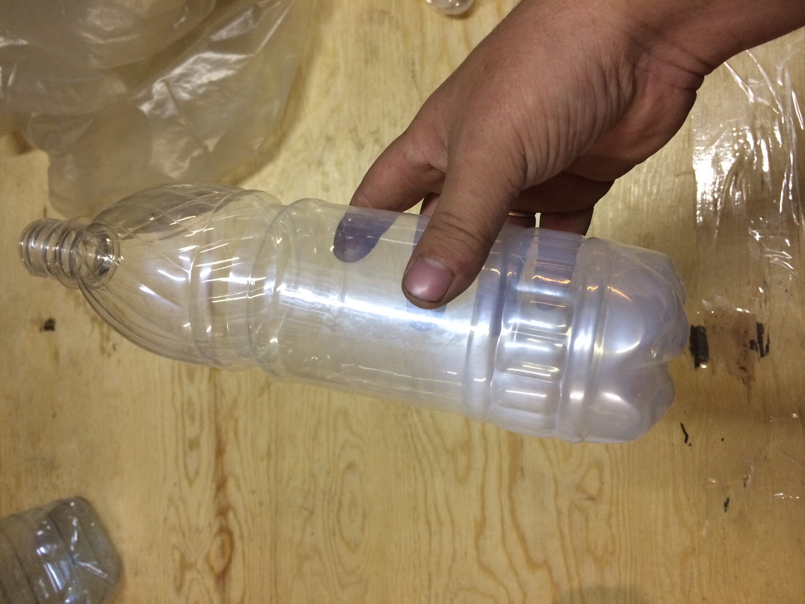 Если вес и хороших и дефектных донышек одинаков (+/- 0,5 гр. не критично), вероятно недостаточно давление основного дутья или его время, также может недогреваться преформа или быть некорректно настроен предвыдув.