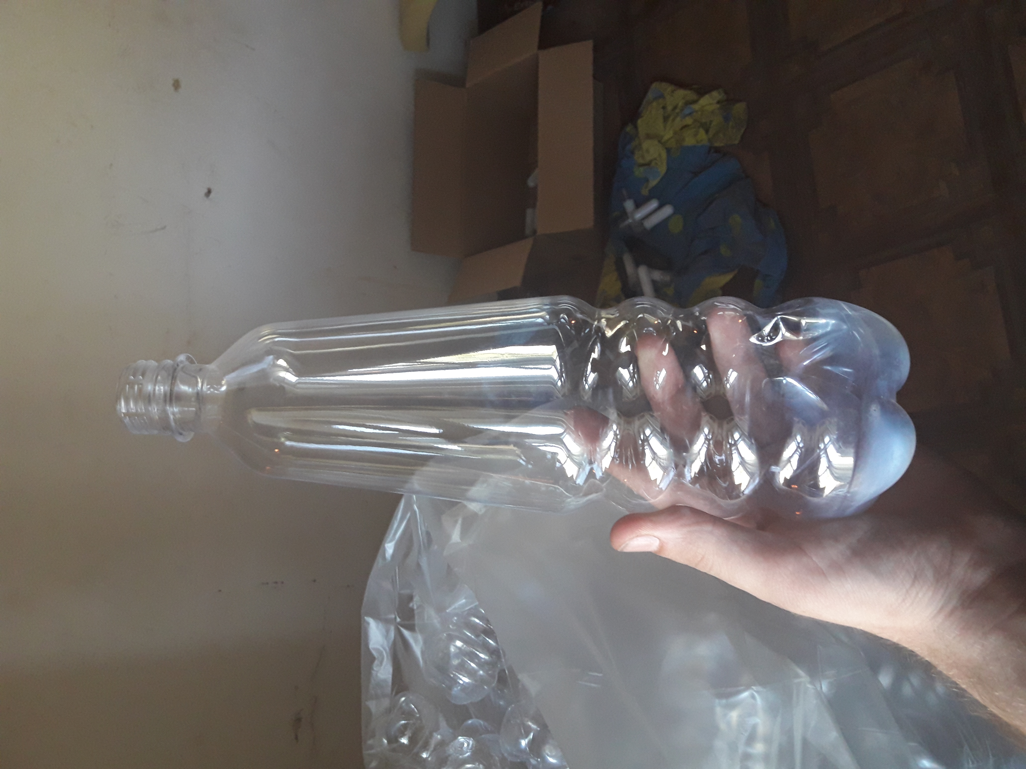 По поводу преформы: 18 гр., короткая и малого диаметра - качественно прогреть сложнее. Если бы работали только с этой преформой можно было бы попробовать регулировку ламп (перестановку в печи), если печь ламповая а не ТЭНовая. С ТЭНами тоже можно, но ТЭНовые печи в принципе сильно инерционны, меньше вероятность успеха.