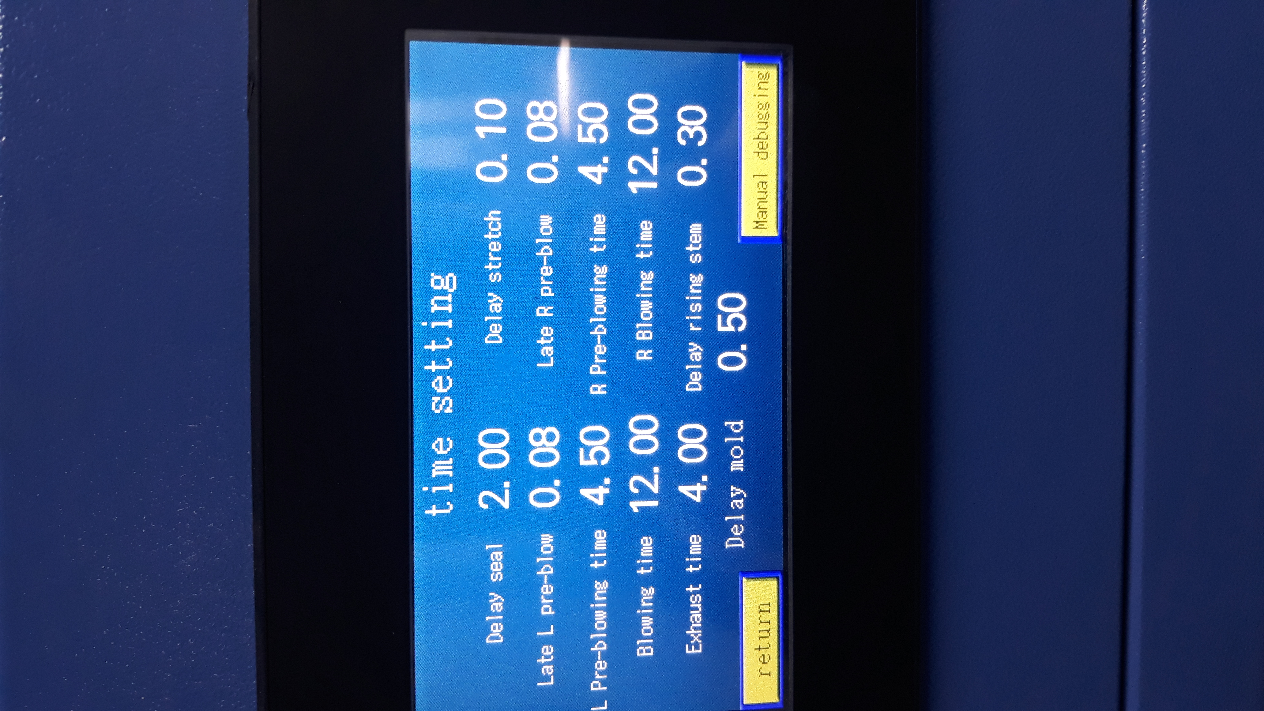 Пару месяцев назад настраивал 19 л многооборотную ПЭТ- бутыль в С-Пб, на каждой машине и каждой форме режим может отличаться, и довольно сильно.