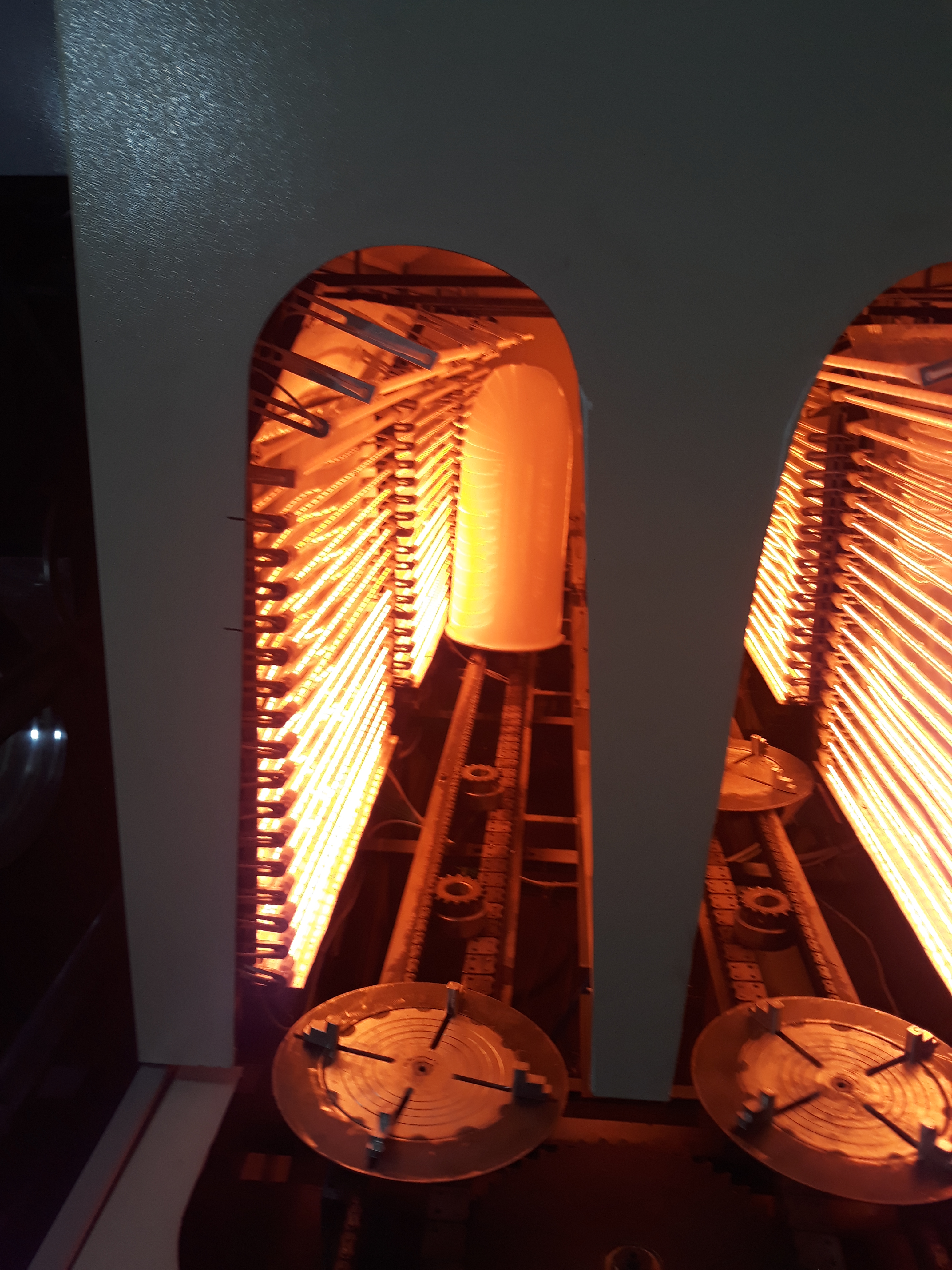 Нагревательный шкаф первоначально был по 16 ламп на одном щите ( лампы диаметром 10мм и длинной 650мм на 800W и 230V ) Щитов всего 6 по 3 щита с каждой стороны . Так как преформа большая то решено было раздвинуть лампы . Но при раздуве на изделие были видны полосы затемнения . И мы решили добавить лампы и тем самым уменьшить растояния между лампами . Четыре верхние лампы установлены по конфигурации преформы и они с отрожательным слоем на лампе . Так же пришлось добавить приборы управления и модули для того чтобы зоны были раздельными . Пробовали раздувать изделия улучшения есть но всёравно пока присуствуют затемнения но уже не такие как было . Размеры преформы пока нет чуть позже напишу а так шар диаметром 600 мм и основание 250 мм
