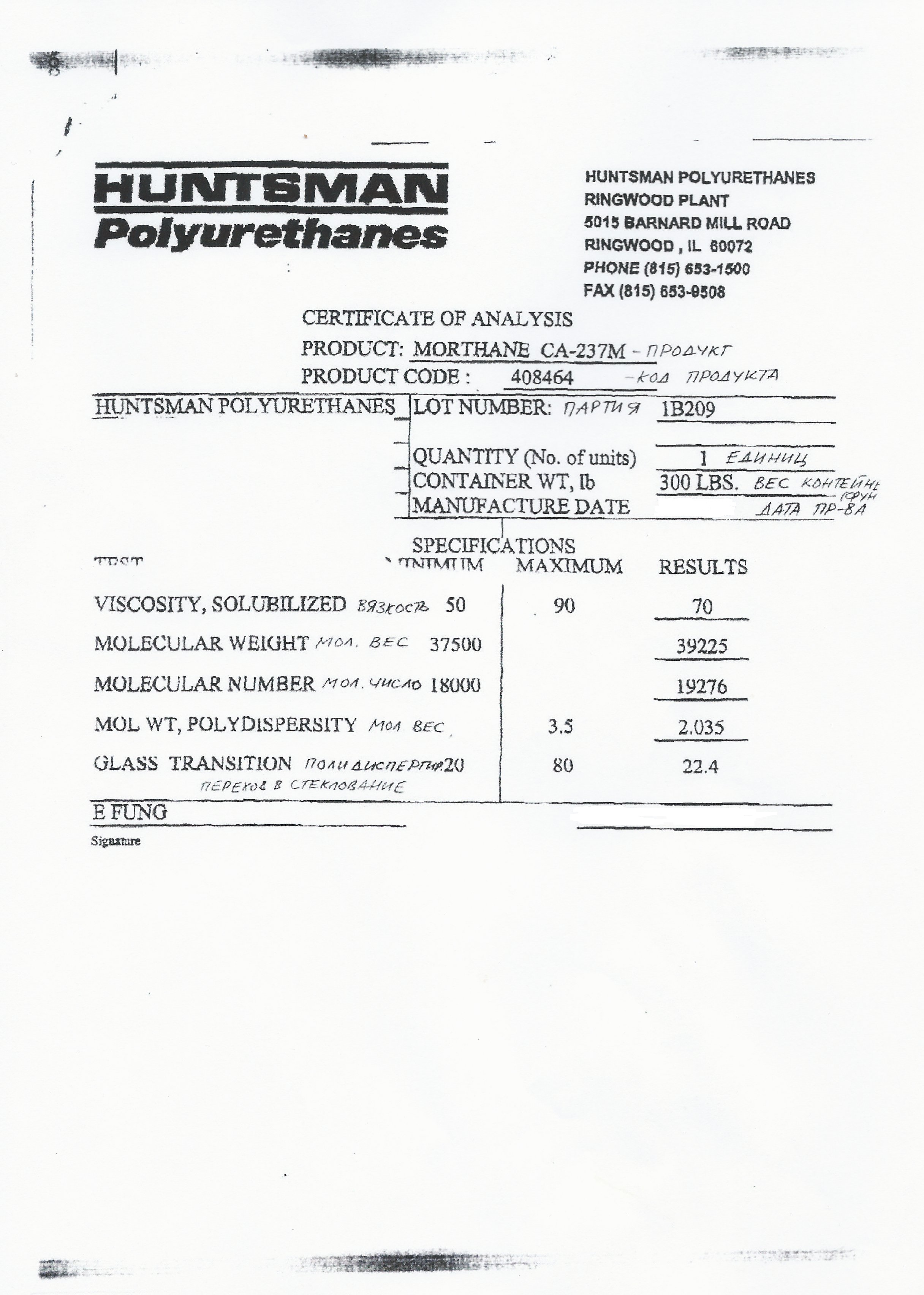 Термопластичный полиуретан марки CA-237 (производитель Америка,HUNTSMAN) упаковка: "Туба" - объём 5000 кг - Цена 125руб/кг
