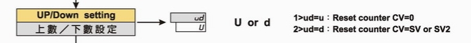 то при установке "U" в ud сброс счетчика будет происходить при достижении CV нуля (такое возможно видимо, при обратном счете), а при установке "d" в ud счетчик будет сбрасываться при достижении установленного значения SV или SV2.
