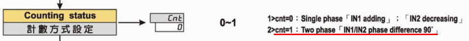Помогите разобраться с входами счетчика .Для этого вероятно нужно понимать меню . Вопрос : что конкретно изменяем в пункте меню "UP/Down setting" например в Fotek MC-36X ? . Пока понимаю что для реверсирного счета к обоим входами счетчика нужно подключить выходы двухфазного энкодэра .Тоесть вход 1N1 для прямого счета,а вход 1N2 для обратного .Тоесть установка в этом меню просто определяет как будет считать счетчик ( например если оборотов назад будет больше чем вперед,то пройдя 0 счетчик будет считать -1;-2...) .Если выход однофазного энкодэра подключаем к входу 1N1 для прямого счета то уставка в меню переключает счет от 0 до 99... ,а для обратного счета нужно перебросить выход энкодэра с 1N1 на 1N2 и изменить в меню счет с 99.. до 0 . Так? Если да то в меню U/D должно быть три варианта или нет ? Пробовать изменить значения в этом меню,чтоб посмотреть сколько там вариантов ,не рискнул из за непонимания .Но в мануале нарисована какая то тайнопись из двух пунктов :1) 1>ud=u:Reset counter CV=0. 2) 2>ud=d Reset counter CV=SV or SV2.Это значит что два режима(U для прямого ) и (d для обратного и реверса)? И если я установлю d появится пункт меню"Mode setting"( перевел как установка режима) и уже там надо чтото изменить для реверса или обратного счета?