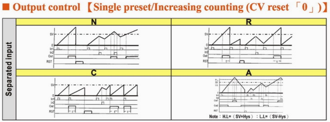 При CV = SV, срабатывает выход Out, но счет продолжается до тех пор, пока не произойдет сброс вручную через вход RST, после чего пропадает и сигнал с Out и обнуляется CV. Причем, если во время включенного сигнала Out, CV опустится ниже SV, то с Out сигнал снимается.