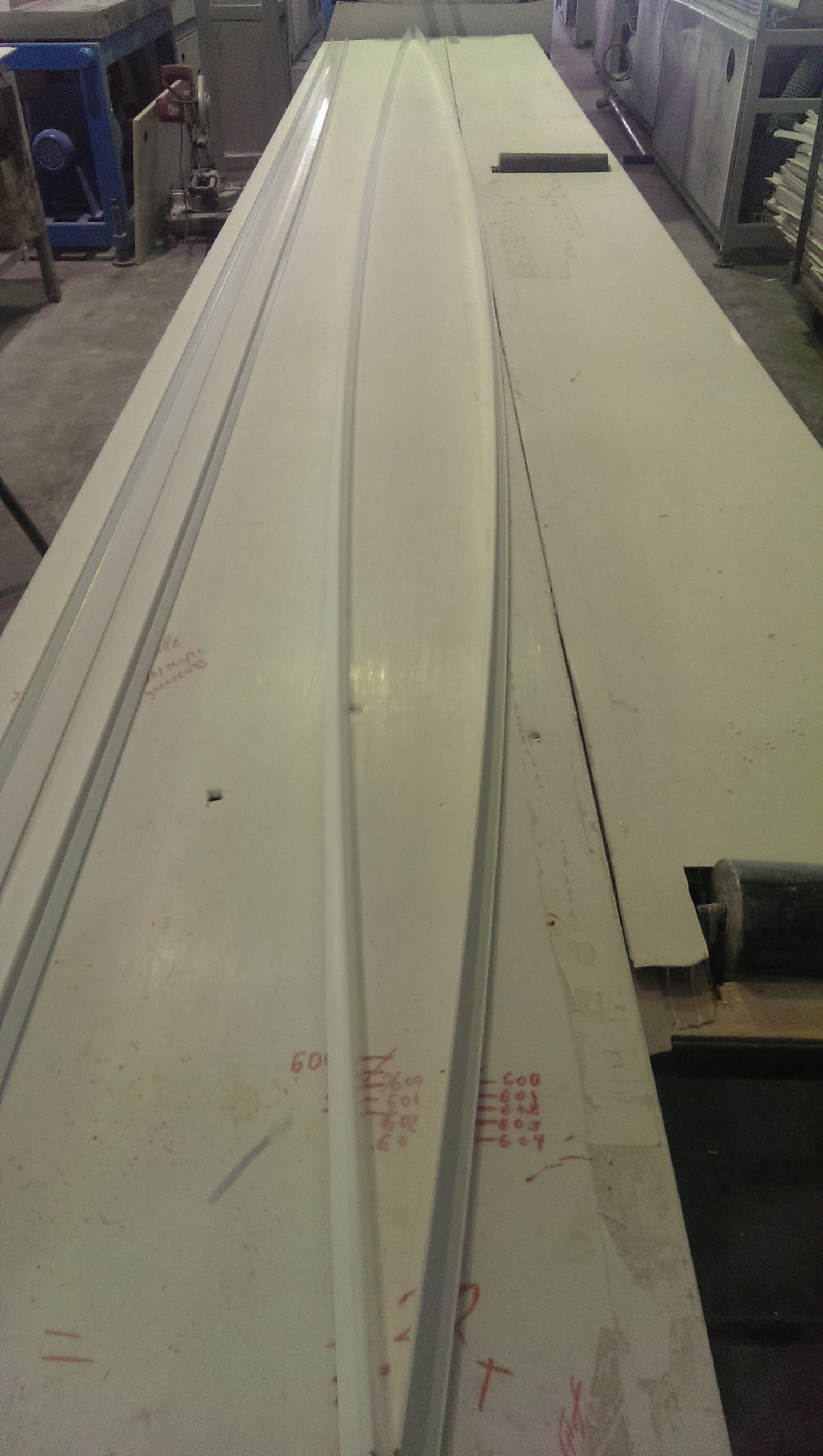 Изделие производится в 2 ручья, на 65 м экструдере коника китаец, есть аналогичные по толщине изделия и по геометрии похожи, и с ними все гуд, а с этим загвоздка, это изделие выгибает вверх, выгибает одинаково, симетрично, фото прилагаю, пробовали все с охлаждением делать, и с вакуумом, ничего не помогает, а победить нужно, помогите кто чем может. В арсенале помимо фильеры сухой калибратор и 2 ванны по 2 метра, температура воды в системе 15 градусов