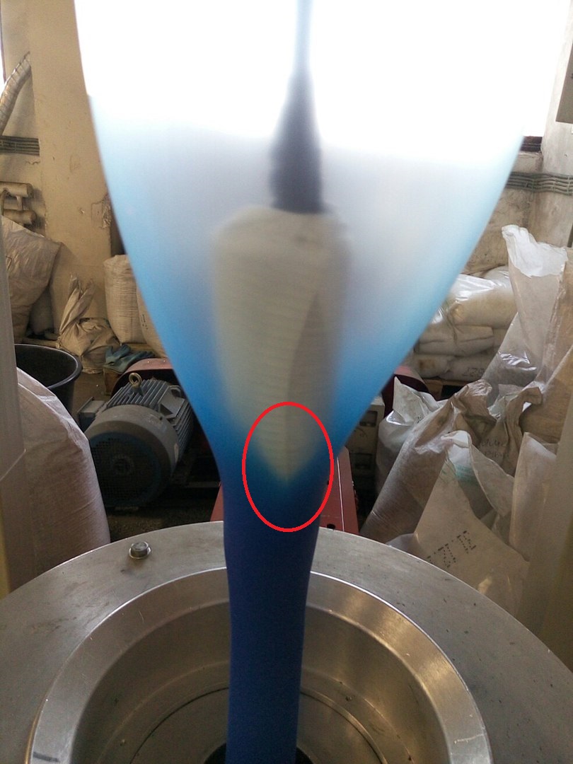 По науке раздув с второй трети колотушки ,высота 7- 10 диаметров фильеры ,а так опытным путем .( если опустить ниже колотушку то прочность должна снизится ,а если уменьшить её диаметр и опустить ниже может не изменится или даже вырости )