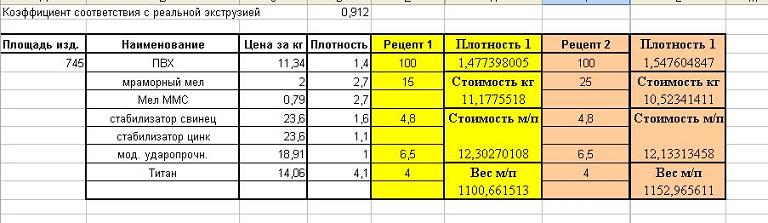 Но для проектирования геометрии профиля (к примеру когда заказываешь инструмент), зная применую рецептуру, которая будет использоваться, пожно правильно всё просчитать и заложить нужные толщины, чтобы потом красиво вписаться в вес м/п готового изделия. По другому, кроме как посчитать по составляющим плотность экструдата (как в таблице), не вижу возможным.