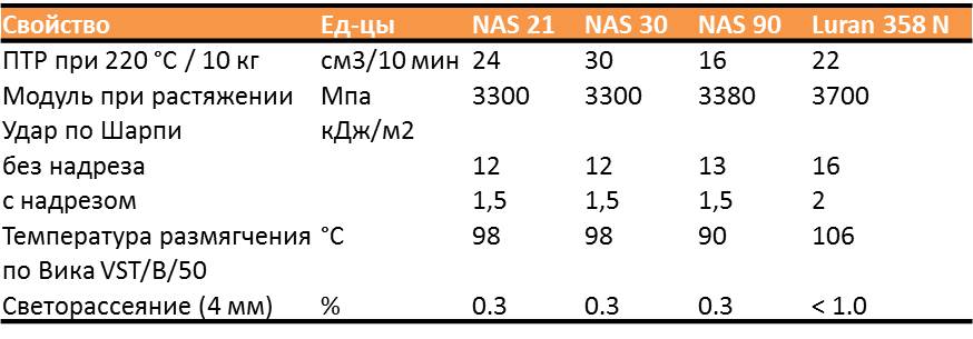 Марки СММА NAS, как и в случае с САН Luran, отличаются молекулярной массой и содержанием сомономера. NAS 30 и NAS 90 содержат по 30% ММА, при этом NAS 90 имеет более высокую молекулярную массу, соответственно ниже ПТР и немного более высокую физико-механику. NAS 21 – стандартная марка с содержанием ММА 21%.