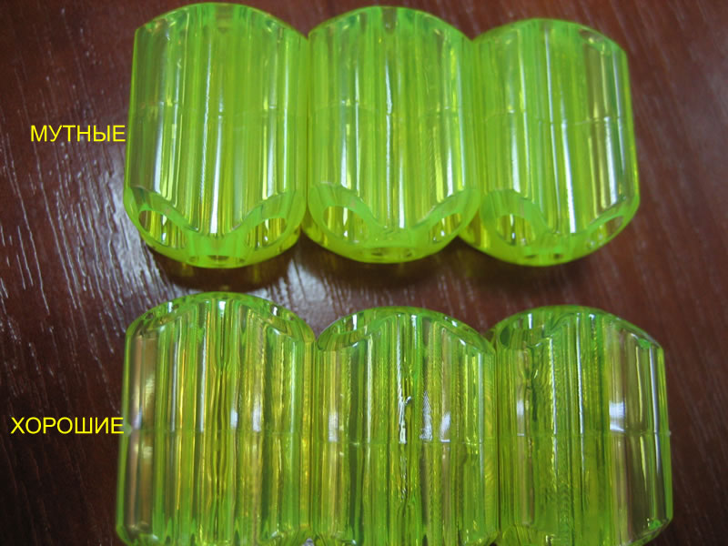Я повесил форму, наладил процес. Лил SAN. Всё у меня пошло хорошо. Потом побрызгал какой-то химией от CHEM–TREND. Кажется антиадгезивом и ушёл домой. Утром прихожу, блин, все детали что машина наворотила двухместной формой за ночь - мутные. Посмотрел в форму там зеркало формообразующих то же мутное. Очень долго и старательно тёр форму. Потом прозрачность наладилась.