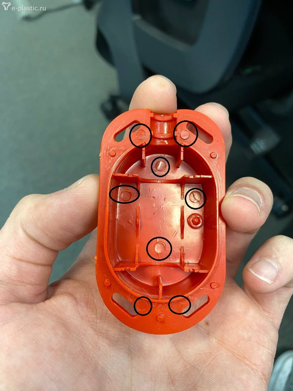 Вопрос в следующем: я конструктивно ошибся в выборе мест под толкатели/ошибся в их количестве и диаметре, либо у меня просто на пуансоне не все задиры убраны? Или же на результат влияет всё в купе? Заранее спасибо за помощь. Ещё раз повторюсь, я новичок и колоссальными ресурсами я не обладаю, до всего допираю по гайдам, книжкам и крупицам информации с форумов. На одном фото я отметил участки с дефектами, на другом отмечено расположение толкателей. Фото пуансона так же прилагаю.