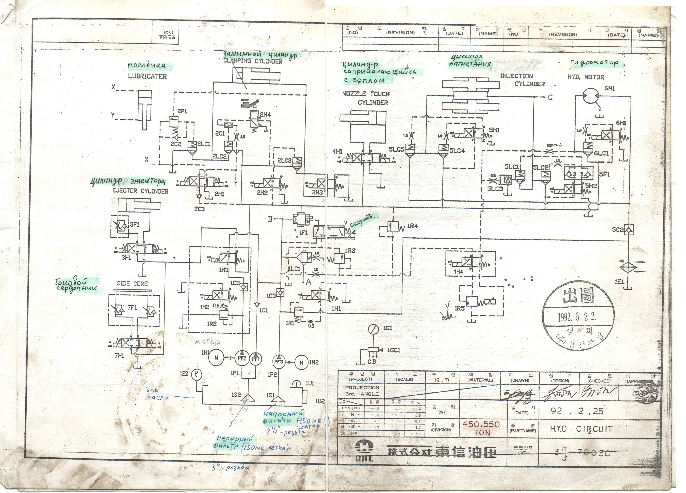 Да там куча параллельно включённых распределителей и логических клапанов, плюс гидроцилиндр смазки :) , который работает по открытию/закрытию формы...
