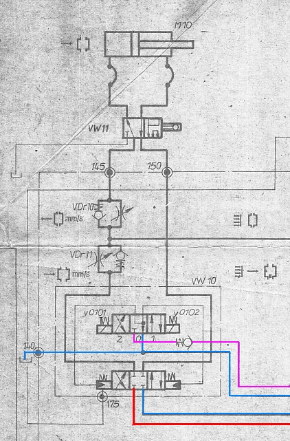 Если давление подаётся сразу на обе полости цилиндра, то перекрученный плунжер в дверной блокировке VW11 самая вероятная причина такого распределения. Однако поток на блокировку нужно подать, значит должен быть открыт(или недозакрыт) VW10. Кстати, ручки регулировки скоростей на смыкание-размыкание ни кто не закрутил 1-го числа?croc писал(а):Посмотри на блокировку под дверью. Может шестеренка неправильно
