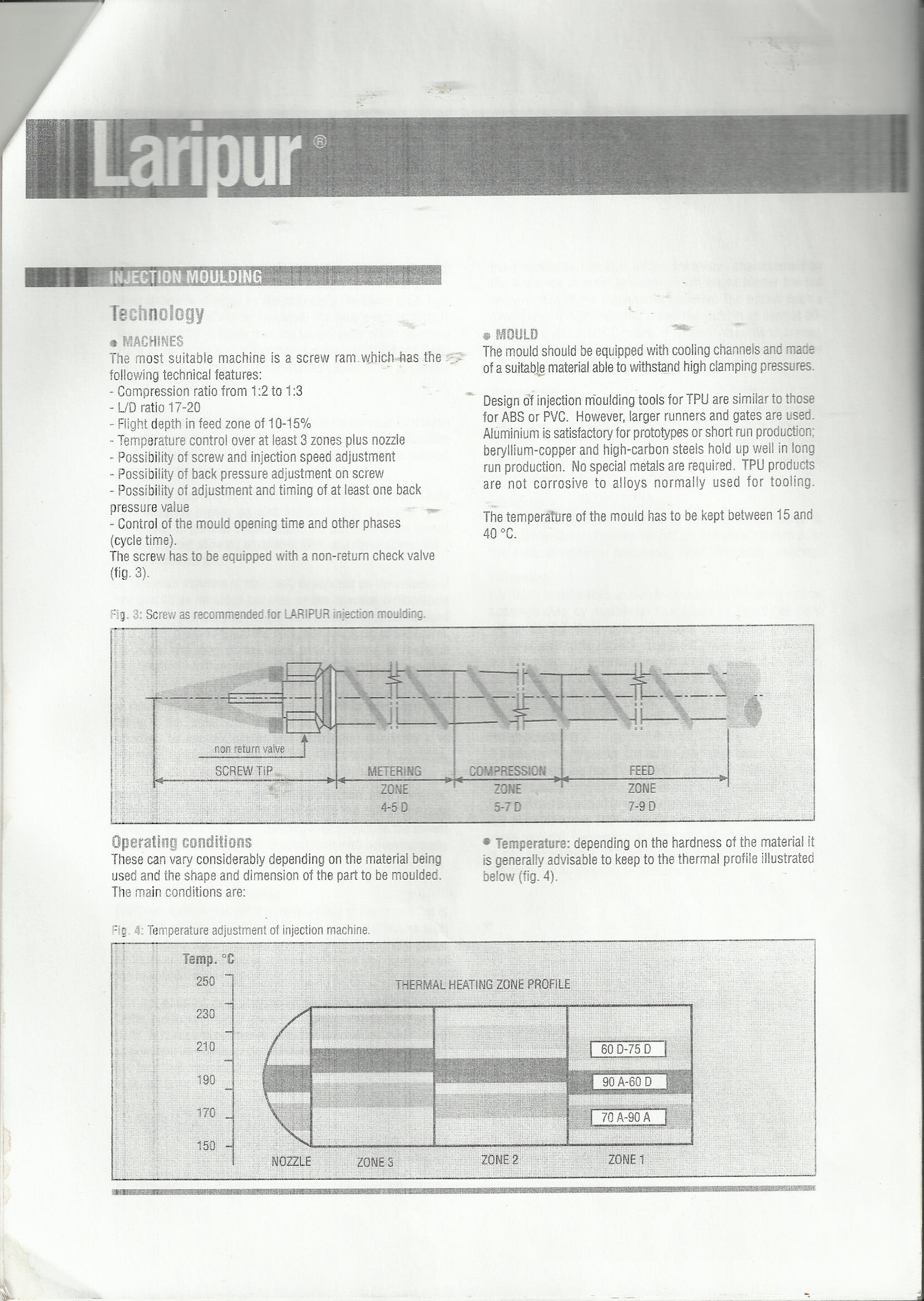 Мы с таким жестким полиуретаном еще не сталкивались, у нас твердость 70А. Льем с открытым соплом, без отвода. Но у нас не Куаси, сопло с подогревом и термопарой. Сушим 2 часа при температуре 85 градусов. Шнеки у нас останавливались лишь при литье поликарбоната и полиамида, пока не приспособились. Факторов довольно много. Главный из них был температура сопла и диаметр отверстия в нём, затем температура по зонам. Не пробовали при остановке набора принудительно отвести шнек назад? Или шнек останавливается наглухо, ни туда ни сюда? Но быстрее всего разносился обратный клапан шнека, быстрее всего шариковый. Сколько встречал куасишки, все были с шариковыми клапанами. И с величиной зон нагрева не плохо бы разобраться.Чикман писал(а):Твердость 73D. Температуры по паспорту 225 - 230 - 235.Karakol писал(а):Правильнее бы было назвать это приспособление на шнеке обратным клапаном, не дающим течь расплаву во время впрыска в обратную сторону т.е по виткам шнека.А запорный клапан ставится на сопло с целью не дать расплаву вытечь самотеком из цилиндра пластикации. И какова твердость по Шору полиуретана? Льем с твердостью 65-70, и хватает 200 градусов расплаву. Может просто перегреваете?