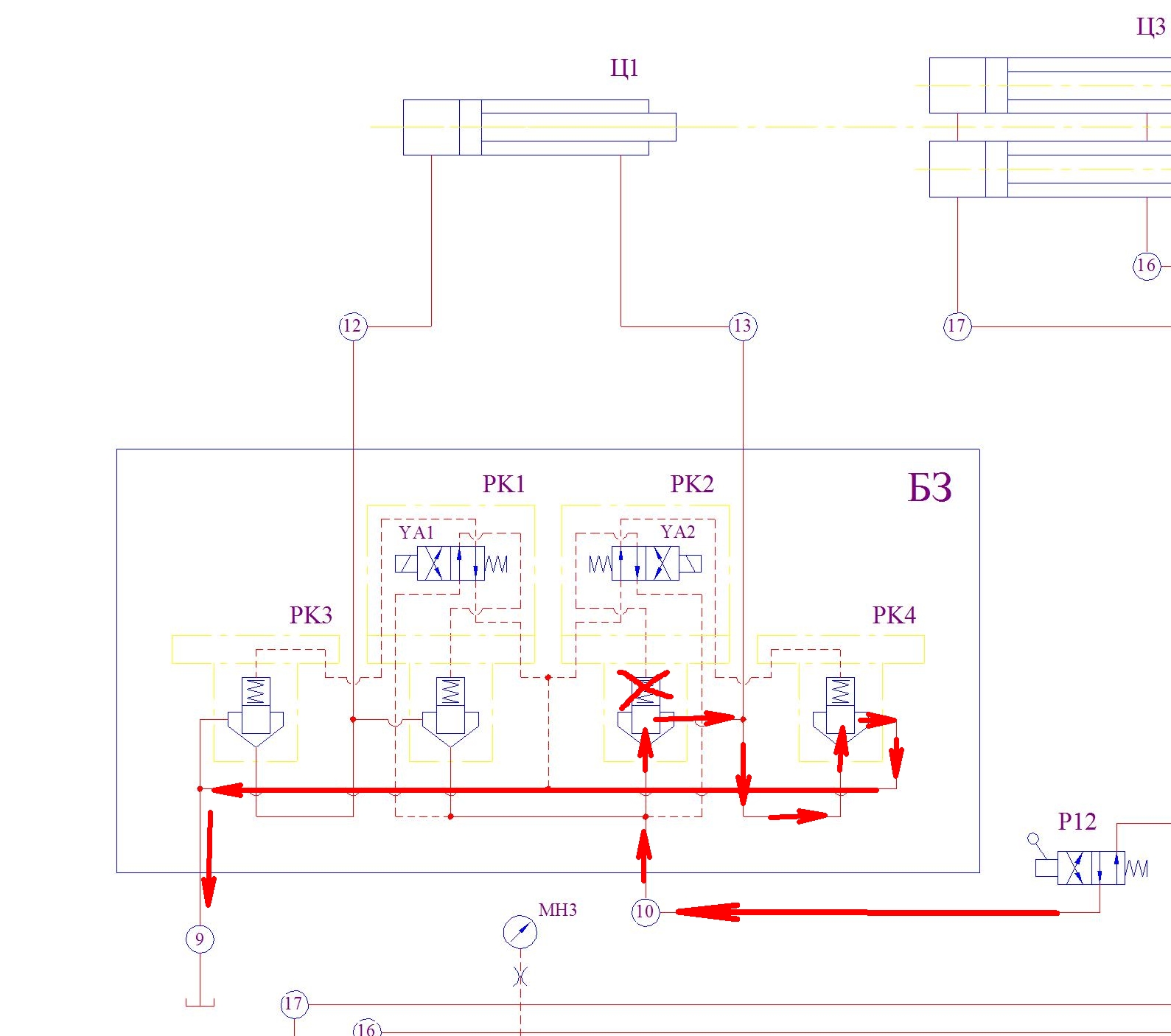 Вопрос второй, включили мы YA1, закрыли форму, рычаги выпрямились, соленоид отключили. Давление в поршневой полости по идеи осталось. Когда включим YA2 на раскрытие, куда слив с другой стороны пойдет. Думаю что все предусмотренно, но может перед раскрытием, кратковременно YA1 включить без насов, сбросить давление как на машинах с заслонкой и цилиндром запирания? Или не заморачиваться? Может по этому и декомпрессия (отвод шнека) хреново работает, с другой стороны цилиндра слива нет, может его как то организовать?