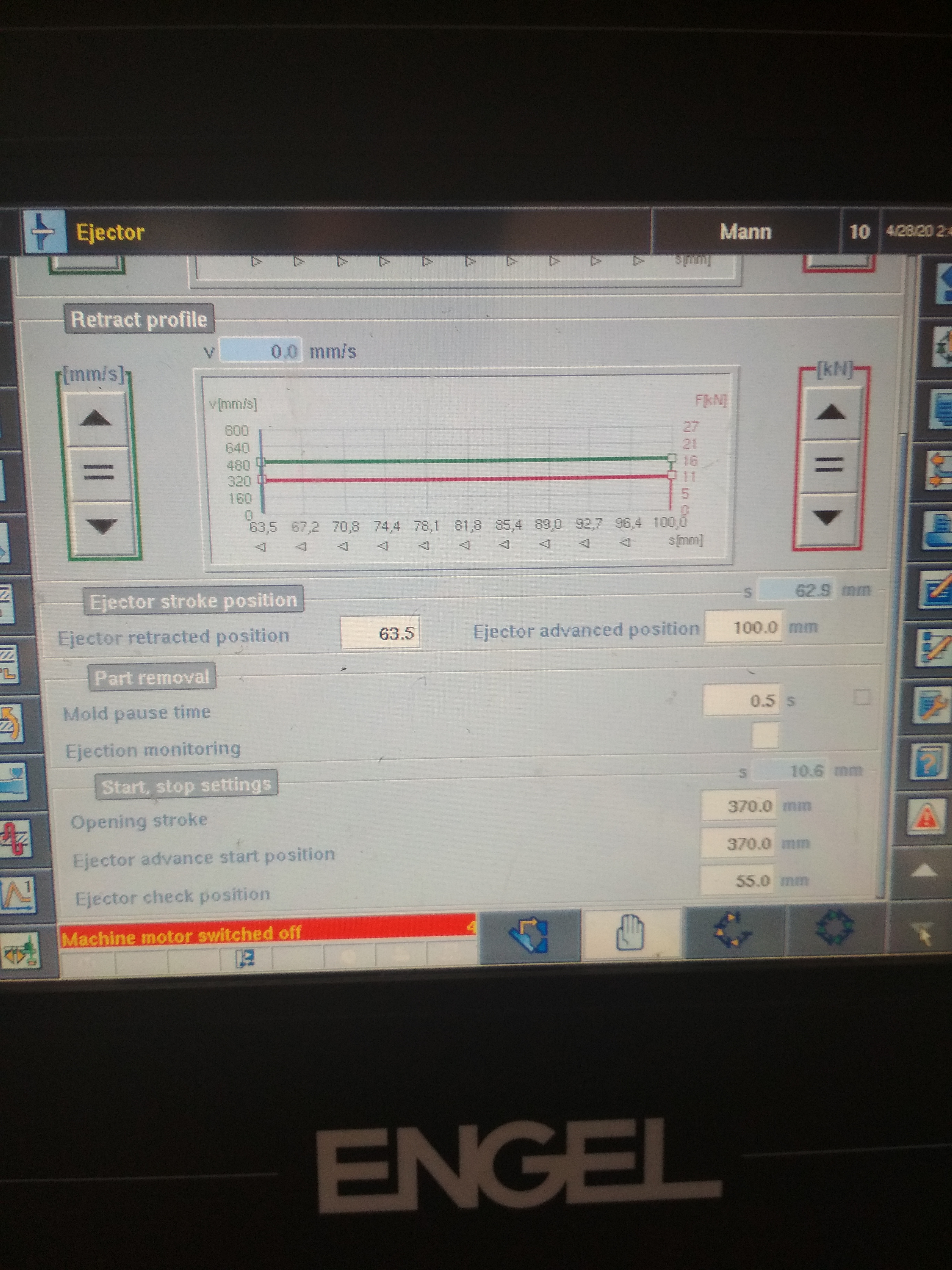 Если настроить все параметры этой страницы, то форма замедленно расцепляется, чтобы не повредить отливку, потом быстро идет до установленной позиции и медленно подходит к точкеmould is off