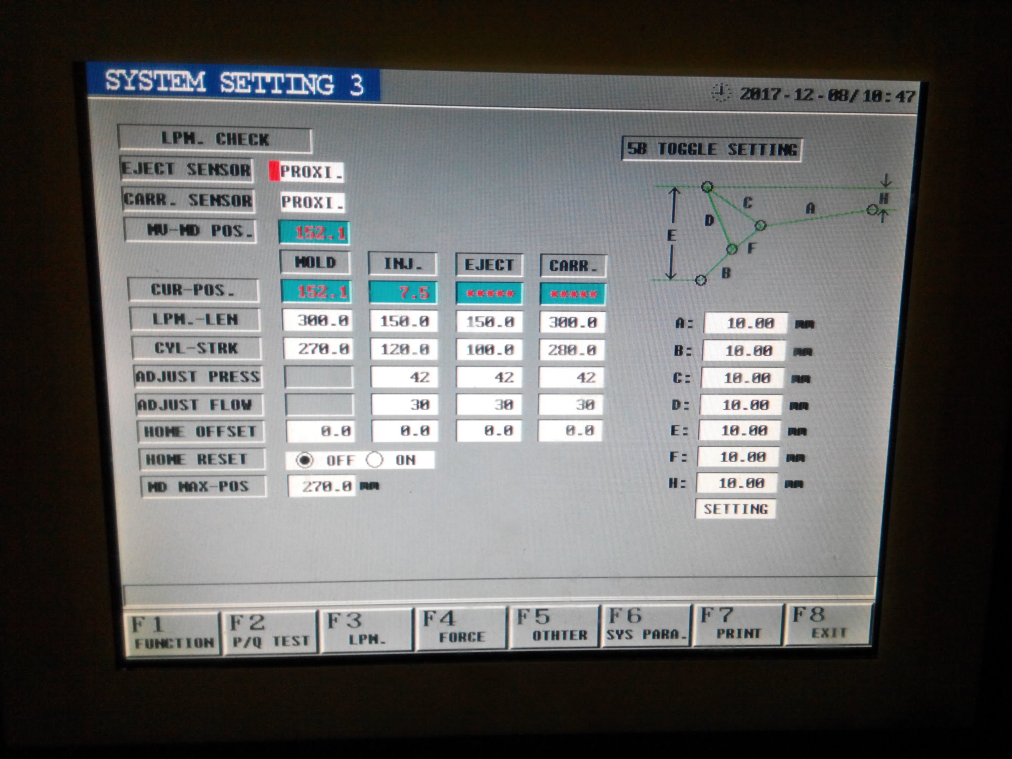 На этой недели начал разбираться с "пальцами" в КРМ. Разобрал самый подозрительный узел. Вытянул наполовину палец. Выработки не обнаружил.Провернул его на 180 градусов по часовой, зафиксировал. Попробовал работу КРМ. Размыкается и смыкается при скорости 35 и плавно. Может чисто субъективно, потому как так хотелось? Не знаю. Но основная проблема осталась.- При размыкании формы при заданном 160 на табло - 140. Форма не выходит на заданную позицию. Толкатели не работают. Данная разница в 20 единиц сохраняется при задании любого положения формы - 100, 120, 140.... При этом наблюдается интересная особенность. Если разомкнуть ПФ в ручном режиме при включенной клавише "MOLD THICKNESS" (нижняя левая кнопка клавиатуры, нажимается перед калибровкой) - ПФ выходит за пределы установленной позиции. При этом в ручном режиме толкатели выходят. Как только отключаешь эту кнопку - толкатели не включаются. Опять нажимаешь - включаются. Напряжения на линейке проверял - в норме +- 24 В. Уже не знаю - что думать, куда лезть?