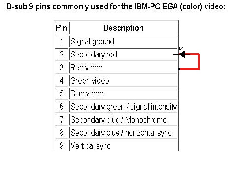 Докладываю. Не с первого раза, но заработало. Видимо, разъемы распаиваются произвольно. Исходил из стандарта IBM PC EGA, но был черный экран, пока не переключил REDvideo на второй вывод. До этого проходило сканирование (красный LED мигал секунд несколько). Использовались 6 проводов: Ground, video RGB, vs, hs.