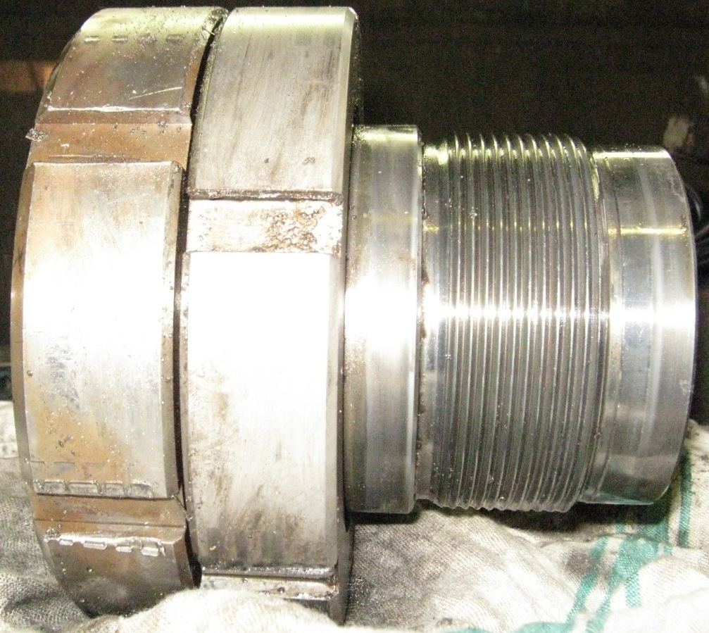Вчера, сегодня продолжаем приседания. Вчера в наладке ходом поршня на впрыск шлицевой конец вала натянули со скрипом, пока хватило хода поршня. Но шлицы до конца не вошли. Естественно, скрутить гайки из-за шлицов вала не получится. Начали думать, как зафиксировать шнек хотя бы на 80 мм от естественного упора. Предложил заполнить цилиндр шнека стеклом и, выставив его в нужной позиции, оставить на ночь. За ночь стекло замерзло и, наконец, утром насадили шлицевой вал до конца, после чего скрутили гайки. Теперь проблема - как их разделить. Там два кольца, внешнее из которых замыкает шлицы зуб в зуб и фиксируется в этом положении штифтом от раскручивания. Штифт цел. Штифтовое отверстие в гайке-мамке имеет то ли выработку, то ли так задумано - пока не разберёшь, не поймёшь.