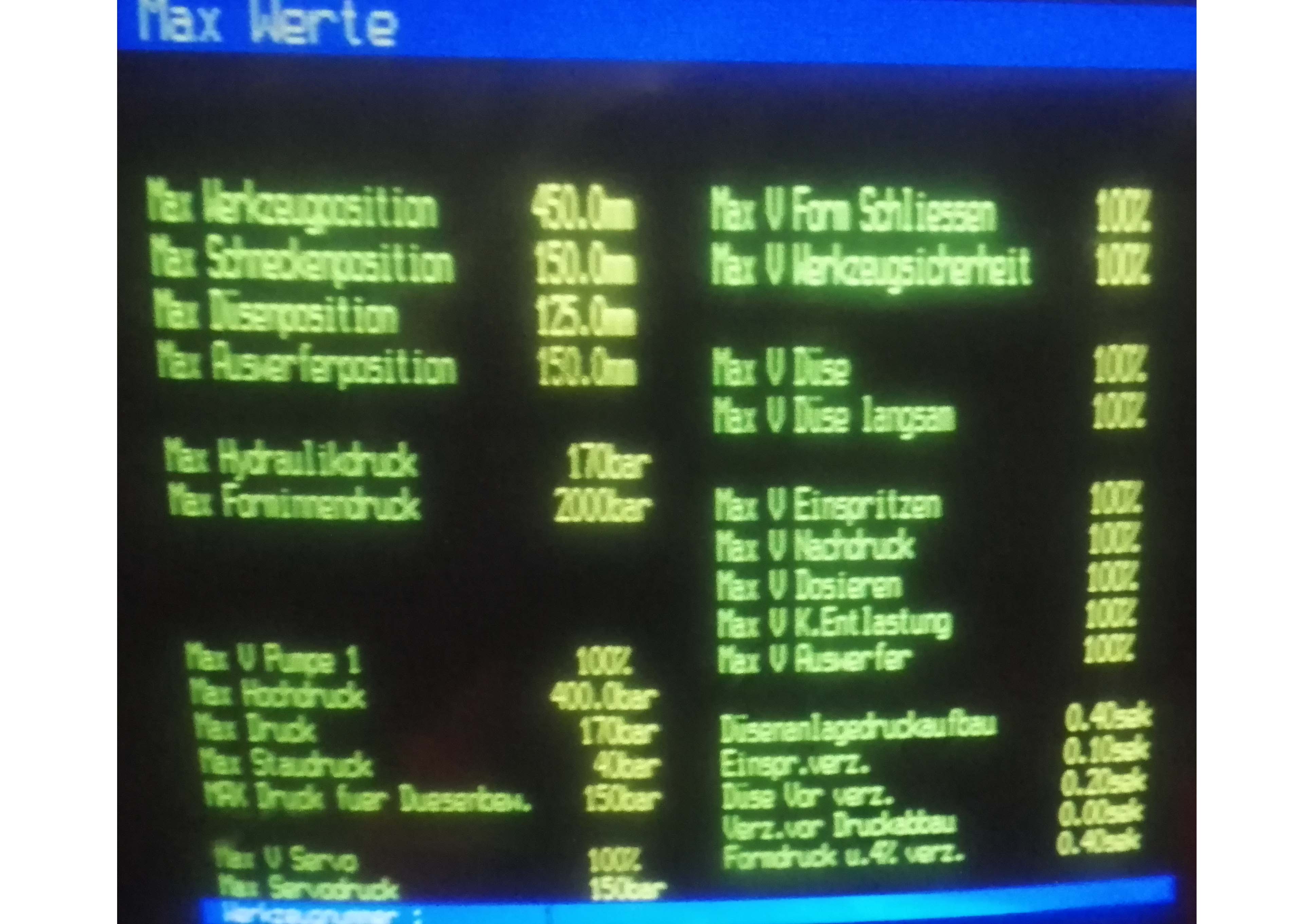 Проверить бы сначала в сервисах (описание прессформы>сервисная установка>1403) экраны: машинные данные, сервисная установка, максимальные значения и далее на предмет явно уходящих от нормы настроек. Аналоговые настройки не сильно отличаются друг от друга. Возможно удастся выявить несуразицу с впрыском. Кстати, а в ручном режиме впрыск тоже максимальный?wings писал(а):На других наших машинах (корейце китайцах) стоят амперметры на линии пропорциональных золотников -- очень удобно, а немцы что то сэкономили !