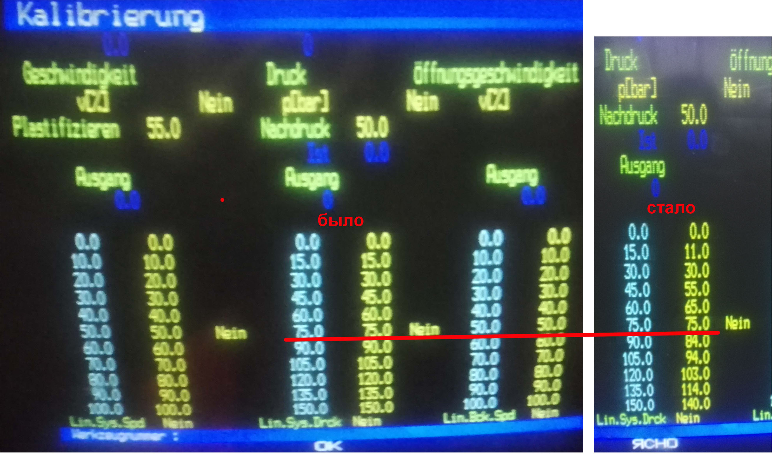 Прыгал между экранами впрыска и калибровка. Скорость впрыска выставил 99%. И методом проб подогнал давление. Стало= Задал 45 бар и на манометре 45 , 60=62 , 100=100 , 150=148. А была вообще песня.