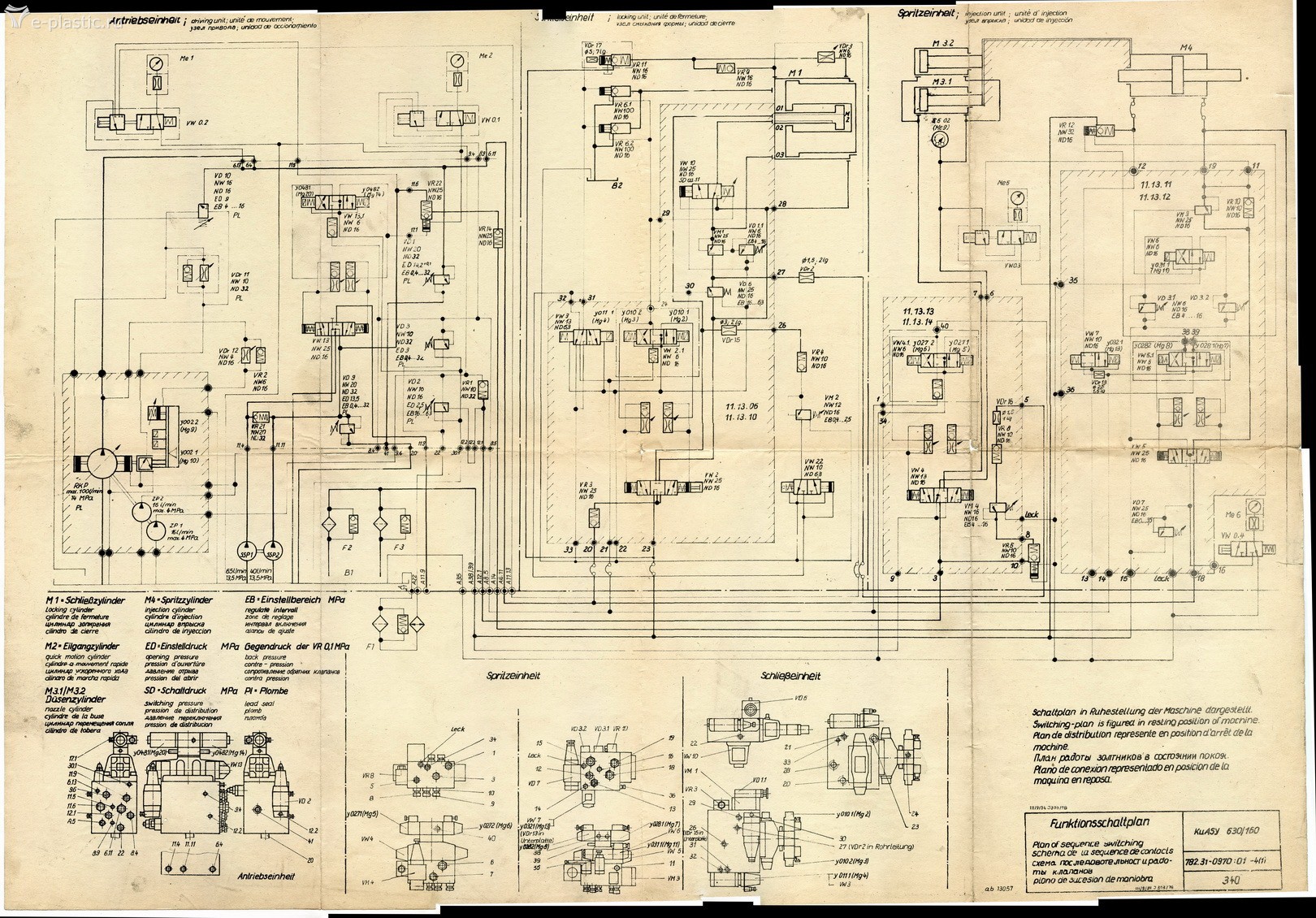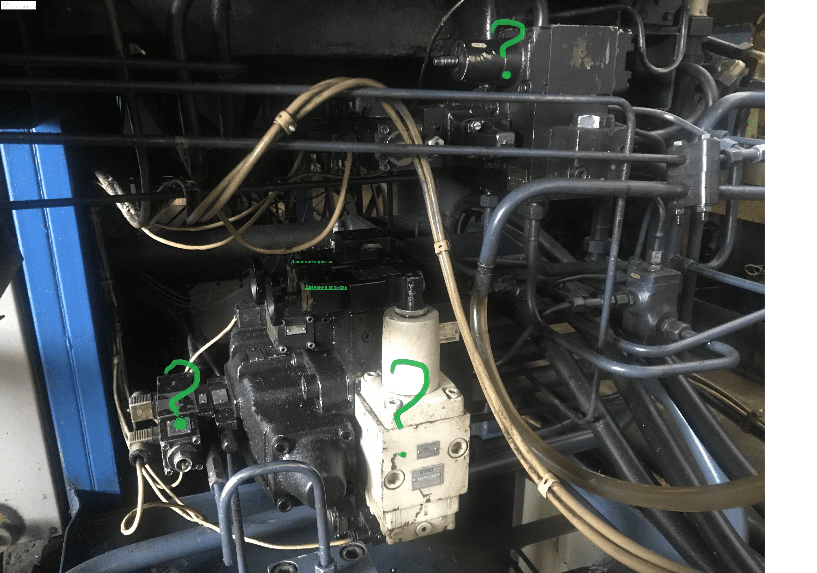 Приветствую! Вячеслав, не бросайте! Пост написали как отрезали (схемы не читаем, иностранным буквам не обучены). Дайте манометр поставлю и пойдут вопросы. Спасибо.ЗЮМ писал(а): ↑21 апр 2023, 09:42Десятое давление принудительного отвода шнека-декомпрессия, происходит от давления VD3=3МПа и ничем не регулируется.ЗЮМ писал(а): ↑20 апр 2023, 17:31Пишу все давления машины: 1) Давление управления Px насоса ZP2-25л/мин. VD3-(3МПа.) 2) Давление перемещения сопла насос ZP1-25л/мин. VD2-(2.5МПа). 3) Высокое давление прижатия сопла.VM4 - (4....16МПа.) 4) Противодавление при наборе дозы VD7- ( 0...3.5MПа.) 5) Давление основного насоса 160 л/мин. VD1- (14.2+0,1 МПа.) 6) Давление вспомогательного гидропривода насосов SSP1+SSP2.65л/мин+40 л/мин. VD9- (13.5 МПа.) 7) Давление усилия запирания формы. VD1.1-(4...14МПа.) 8) Давление защиты инструмента VM2-(0.4...2.5МПа.) 9) Давления впрыска 1,2 ступени VD3.1 VD3.2-(14МПа.) Все.\\\\\\\ Давление основного насоса на схеме прописано 14,2+0,1МПа не зря.!!! Это имеет свой смысл. Важный смысл. Всего сразу не рассказать. По мере поступления вопросов. Схема на КУАСИ 630. Разница лишь в литраже основного насоса и шестеренчатого сдвоенного. Пределы давлений такие же.