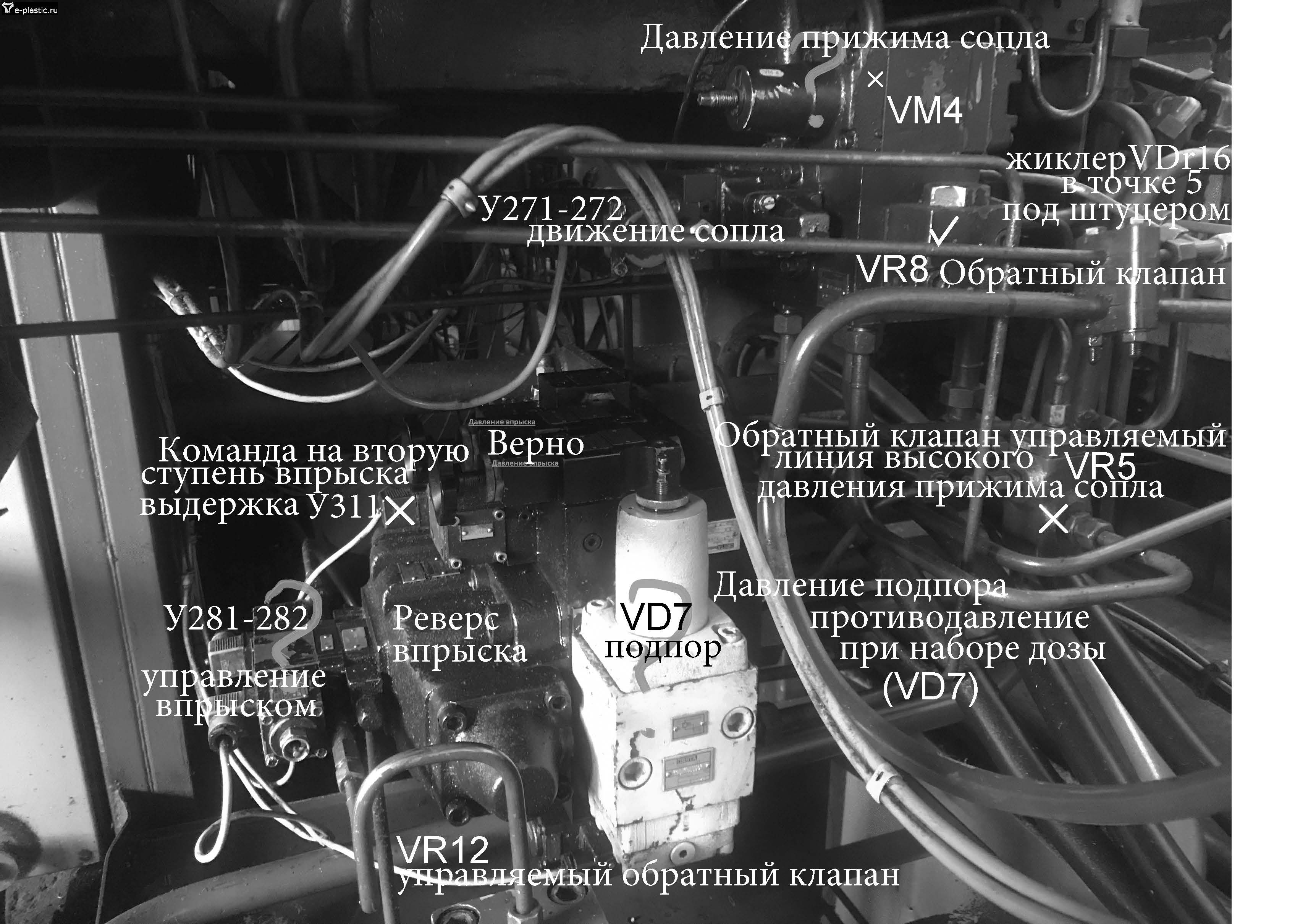 На вашем фото VM1. Настройка регулировочного винта отличается от заводской, вижу по количеству витков резьбы, также заметны следы на гайке от зубила. Повидемому ращбирался на месте. Это замечание не руководство к каким либо действиям. Нет информации для анализа. В частности- Как отрабатывает давление силового зажима формы. Как ведёт себя манометр зажима формы. По VD1.1 вижу что накручен на максимум по силовому зажиму формы. Вопрос. Повторный. Какое давление прижима сопла в цикле в момент впрыска на правом манометре? Левый манометр прижима сопла в цикле показывать ни чего не должен. Чистый ноль. Если показывает, это неисправность в системе. При такой ситуации высокого давления прижима сопла не будет. Угроза подлива сопла, залив обогрева, съем шапок.
