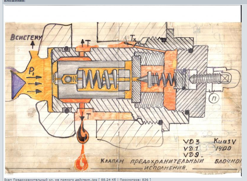 Давление за поршнем меньше чем перед поршнем за счет демпфера 0,8 мм в центре поршня и поршень вынужден приоткрыться слив масло в бак. Как только давление перед поршнем и за поршнем сравняется пружина переместит поршень на закрытие слива в бак . далее по новой давление увеличится перед поршнем и приоткроет поршень на слив в бак. Тем самым поддерживается постоянно щель на поршне с большой частотой не видимой глазу на манометре и поддерживается автоматически настроенное давление иглами в линии управления за поршнем.( Весь фокус в мгновенно меняющемся перепаде давления перед и за основным поршнем. А регулируя иглу вы меняете поток управления с условного нуля до 6 литров в минуту тем самым держите щель на основном поршне больше или меньше вплоть до ее ликвидации. В случае ликвидации шели давление зашкалит и КИРДЫК. поэтому клапан торируется и путем высоты пружины над иглой или ограничением винта и другими способами.) Где циркулирует очень слабый поток управления от 0-6 литров в минуту грубо. если хотите понять досканально. Могу отсканировать тех паспорт на предохранительный клапан не прямого действия отечественного производства с подробным описанием и чертежом. Потребуется напрячь абстрактное мышление и проштудировать принцип работы. Принцип един для всего мира гидравлики относительно этого аппарата. Кстати маленький шарик на давление не влияет. Выбрасывали и разницы не замечали. Задавали вопрос кандидату тех. наук ни чего толком не сказал. Ведь как только включили насос , шарик всегда во взвешенном состоянии так как поток управления проходящий через жиклер далее к иглам циркулирует постоянно. нужно подтянуть теорию. Дайте почту пришлю необходимую литературу.olmvin писал(а):Все таки не совсем понял. Вот эскиз подобного клапана (спасибо ЗЮМу). На сколько я понял, при открытии поршня происходит сбрасывание избыточного давления через каналы "Т". Сам поршень подпирается пружиной и давлением создаваемым дросселем VD01.4 ? Или как?Мулланур писал(а):В торец клапана VD01 поступает масло из системы, которая подрывает маленький шарик в поршне и через маленький канал с боку рядом с резьбой клапана масло проходит в торец к иглам VD1.4, VD1.2 и VD1.1 которые регулируют давление. Как только масло смогло преодолеть усилия сжатия пружины под которой находится игла VD1.4 поршень VD01 подрывается и излишние давление сбрасывается через большие отверстия клапана VD01.