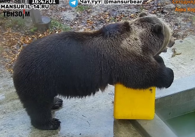 Сам медведь Мансур, для которого нужны игрушки: Это фото как раз демонстрирует как Мансур упирается и давит весом на мяч На Ютубе есть трансляция из вольера медведя, можно посмотреть как он играет в бассейне с мячом, спасательным кругом и булыжниками. А так же как пытается сломать всё, что попадётся под лапу.