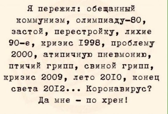Ковид, малыш, ты коронован засуслеженно, респект. Ты стал лакмусовой бумажкой, проявителем. Человеческих качеств, общественного строя и всего остального. Ты, давай на ты если ты не против, противник достойный, но не втом плане что ты как вирус достаточно хитёр, хотя нужно констатировать что ты всего лишь вирус и например дуру валяешь когда имунный ответ человека приводит к увеличению летальности, а тебе то это не наруку же. Вирус и вирус, не страшен ты, а через некоторое время мировая наука, а она тоже не пальцем делана, загонит тебя за можай, тут вемя главное, современем ты малыш не то что поумнеешь, ты же всего лишь вирус, а отбором естестественным станешь менее злым и летальным, а учёные найдут средства борьбы. Вопрос времени. Меня больше волнует не медицинский аспект, а общественный. Будущее волнует, кстати не очень сильно волнует, так как волнения, страхи, депрессии угнетают иммунитет, возможно посильнее чем сигареты,.. кхе-кхе-кхе...