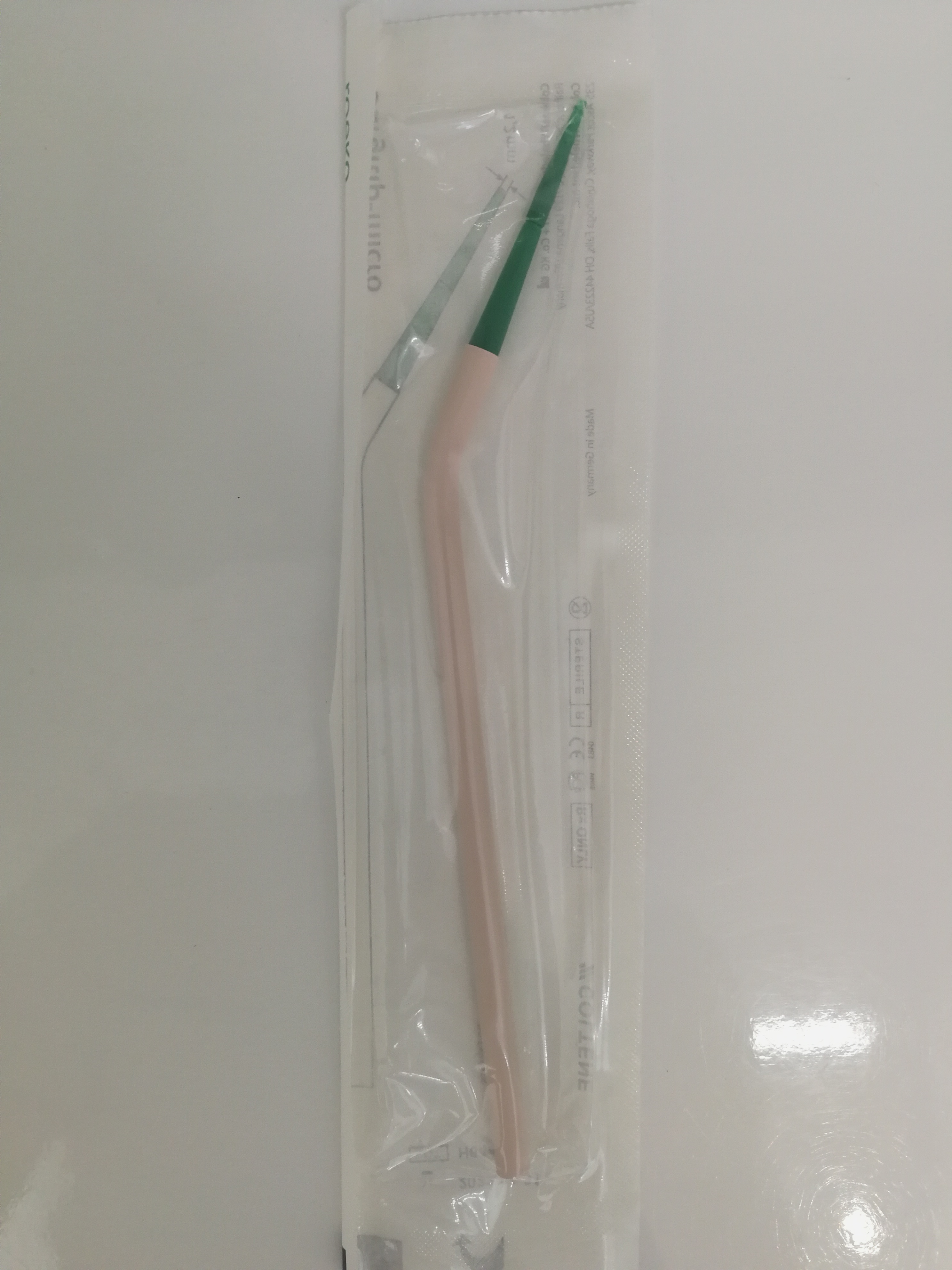 Это хирургический аспиратор, темный носик состоит из двух частей, они съемные, если присмотреться там видно соединение. Первичная стерилизация - холодная + УФ(ултафиолет излучение), повторной не подлежит. Изделие используется для аспирации биологических жидкостей в процессе хирургических вмешательств, одевается через переходник на шланг аспиратора (специальный медицинский пылесос)