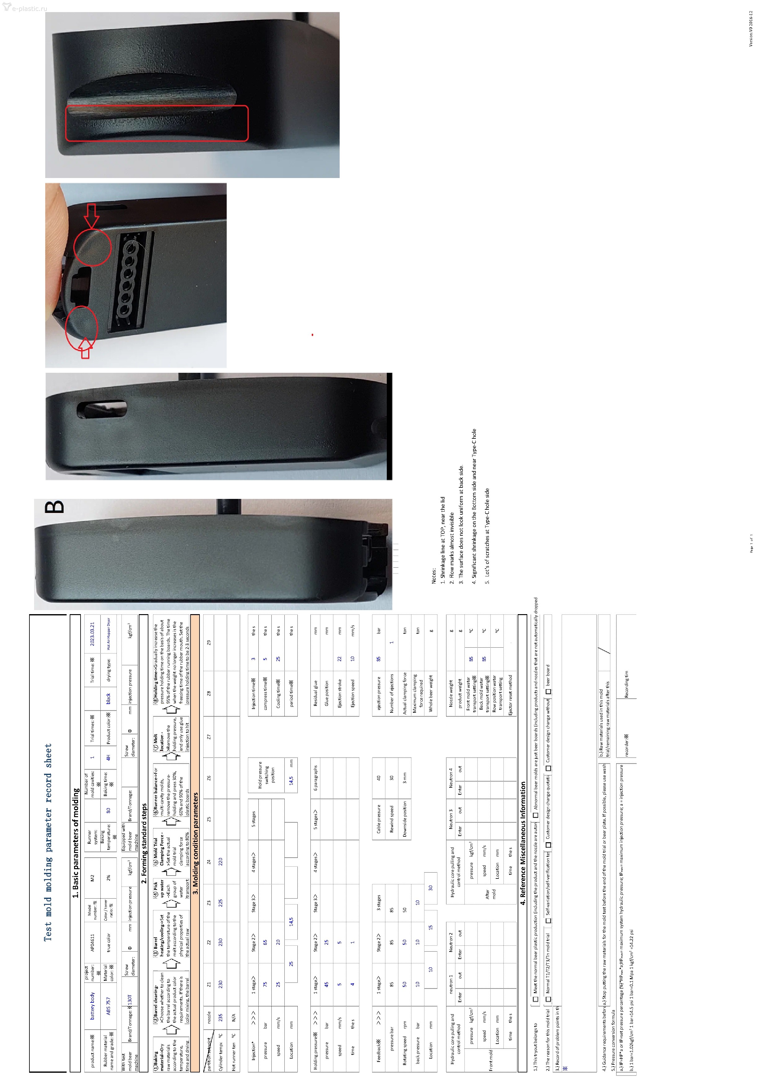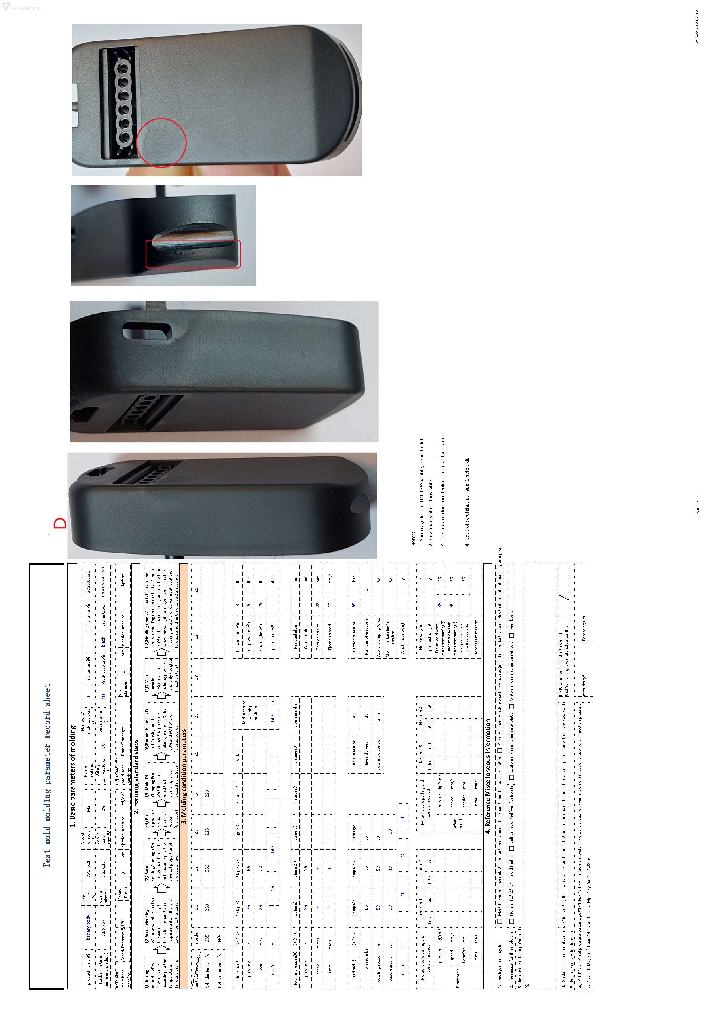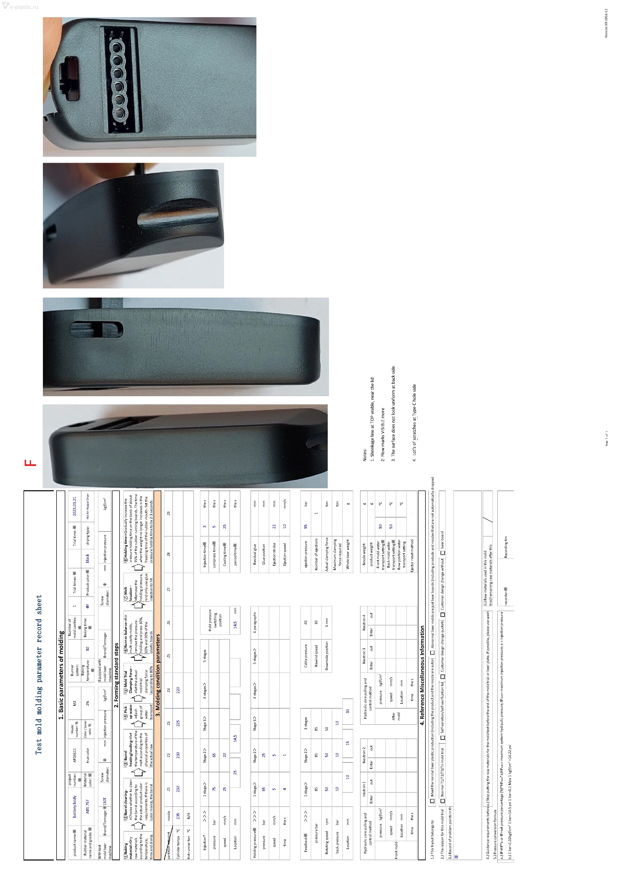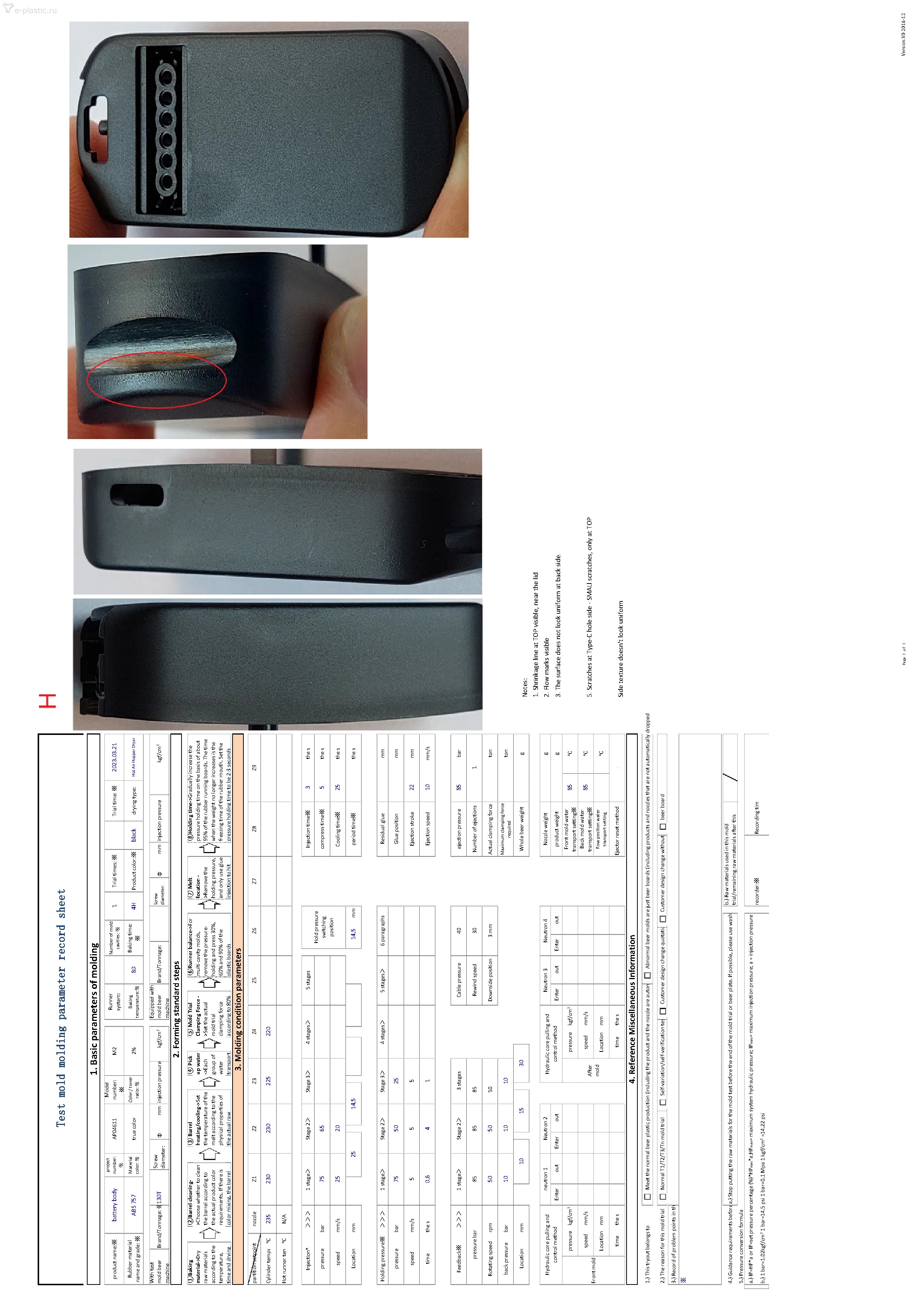 Больших изменений я лично не увидел. Я бы градусов на десять все зоны поднял . 5 секунд давить такую детальку по моему не нужно. 2-3 секунды хватит. Что с температурами формы? А вообще я считаю, вся проблема в плохом качестве шагрени. Не удивлюсь , если пятна уже на ней .
