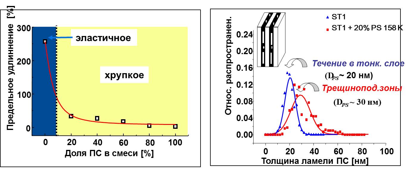 Модуль упругости и температура размягчения для смесей линейно зависит от соотношения ПС/Стиролюкс. Ударная вязкость и предельное удлинение имеют вид S-образной зависимости. Однако даже в области небольших дозировок Стиролюкса предельное удлинение растет существенно (в разы, т.к. собственная способность ПС растягиваться очень низкая). ОПТИКА
